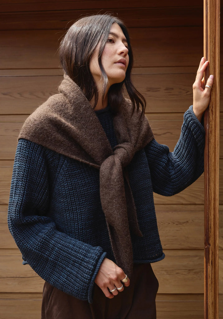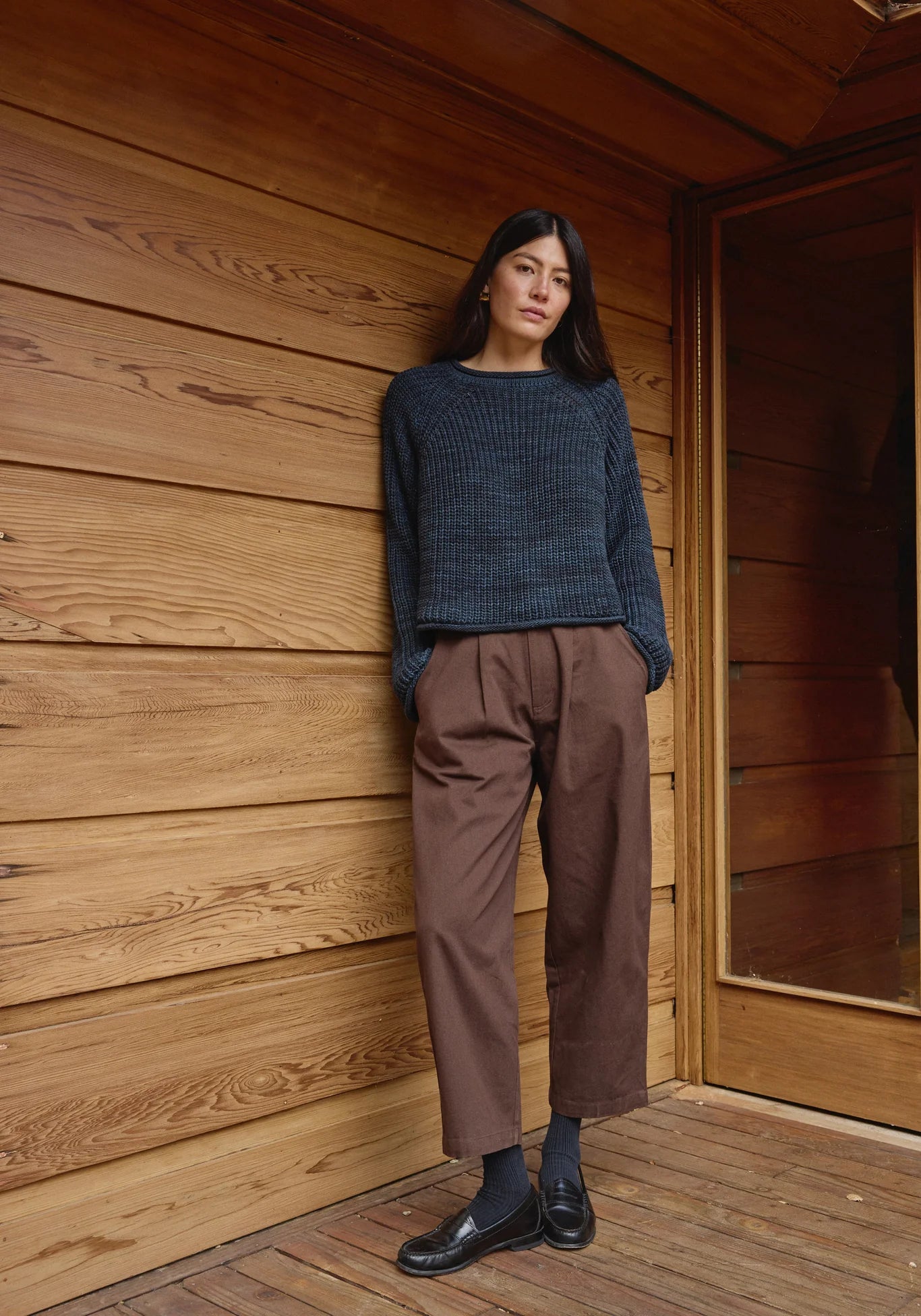 A chunky, cozy cotton sweater with an intriguing yarn dyed technique that adds variety and dimension. Made in a raglan silhouette with rolled hem details.