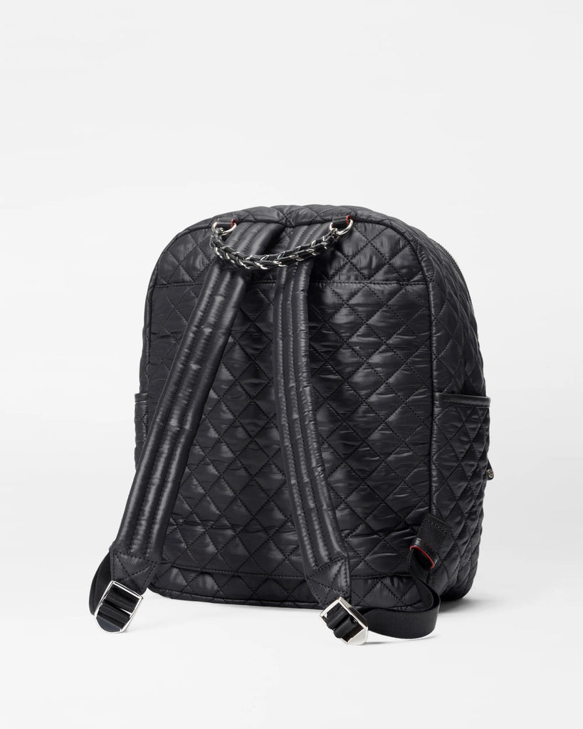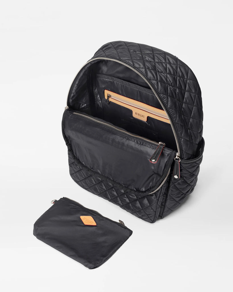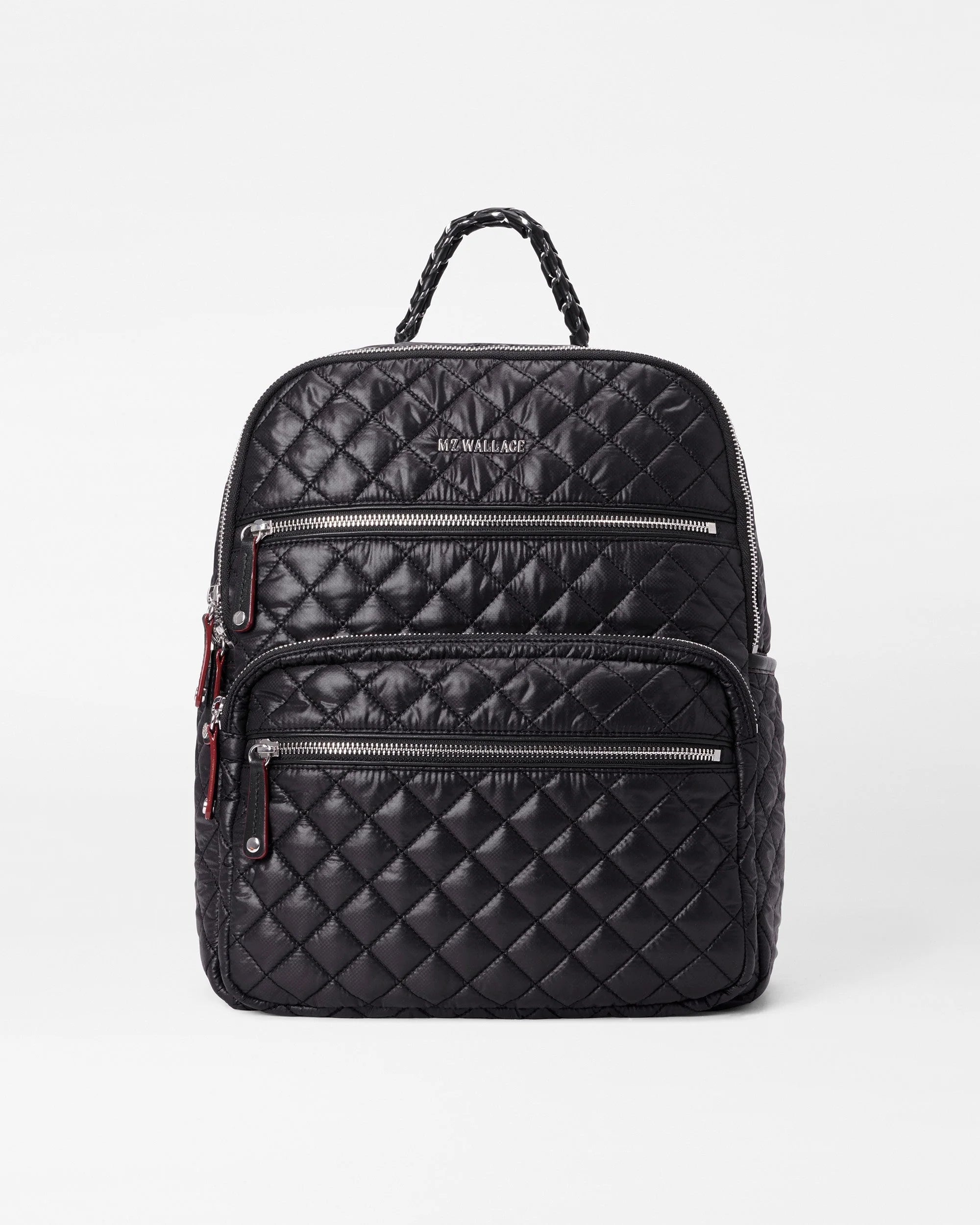 A chic carryall for on-the-go lifestyles. The Crosby Backpack is an elevated style made with the signature MZ Wallace quilted nylon style. Features 6 exterior pockets, with a laptop pocket, zip pocket, and detachable pouch interior.