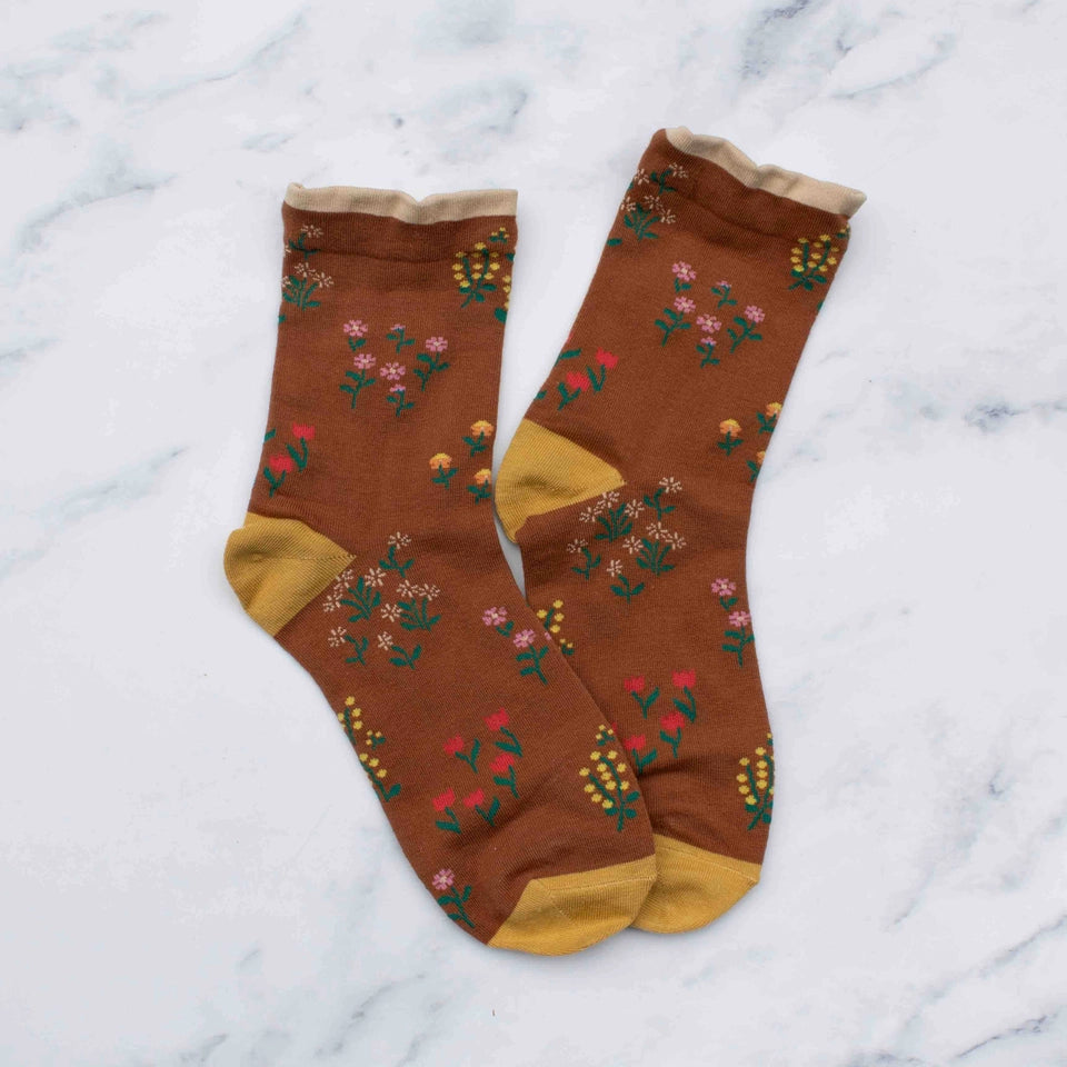 Tiepology - Penelope Floral Casual Socks (Rust/Taupe)