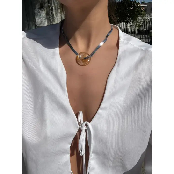 Refined elegance meets contemporary design. The lustrous metal of the flat herringbone chain creates a sophisticated foundation for the distinctive gemstone donut centerpiece. Understated luxury with visual impact.