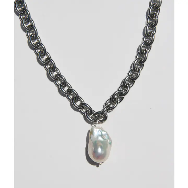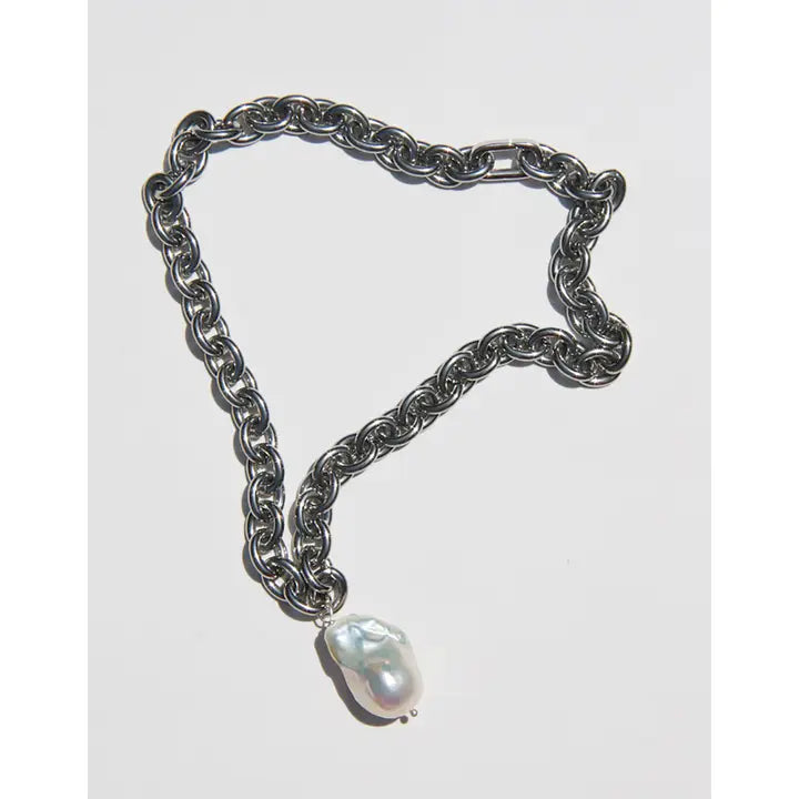 High polished and thick rhodium cable link chain. Single baroque pearl hangs from the center.