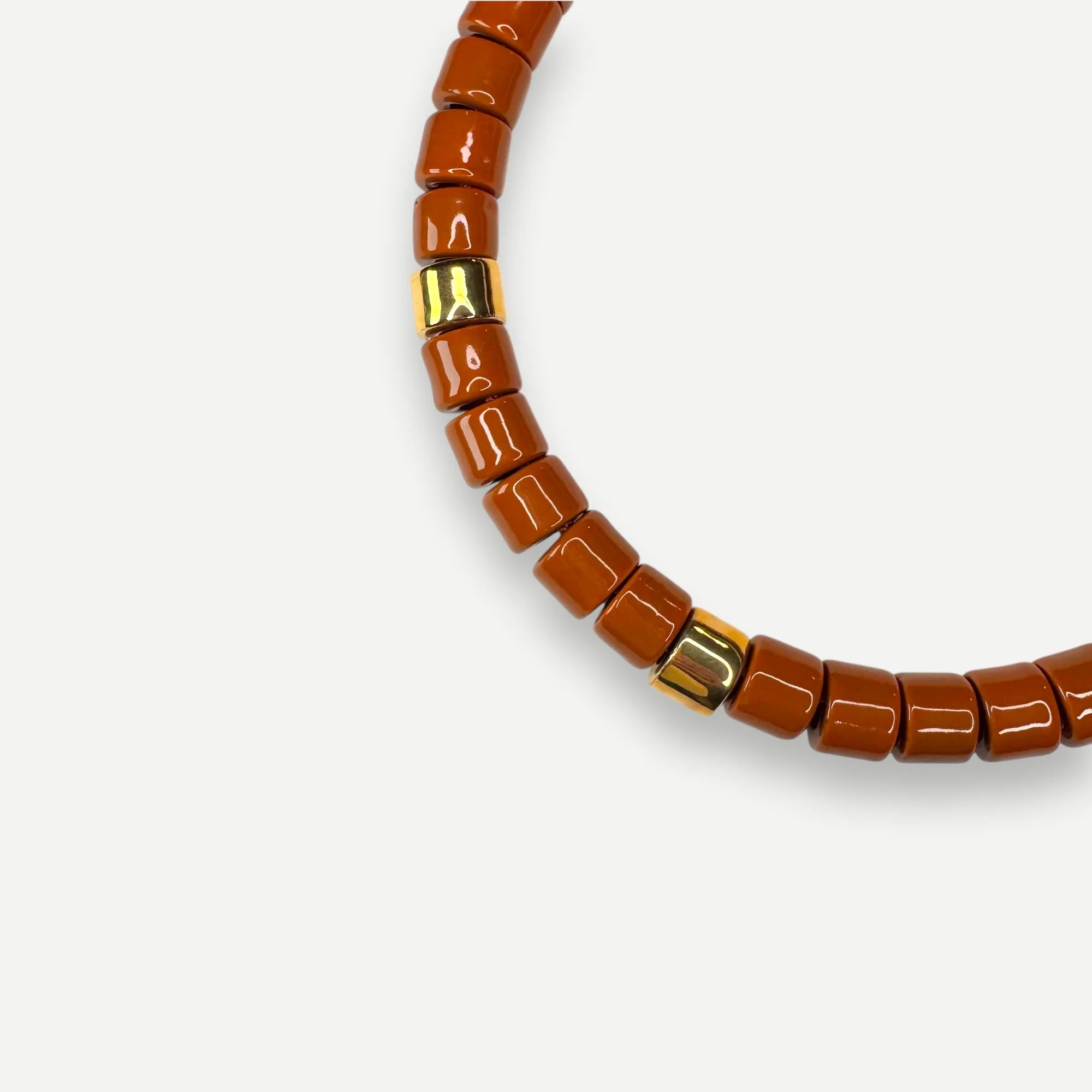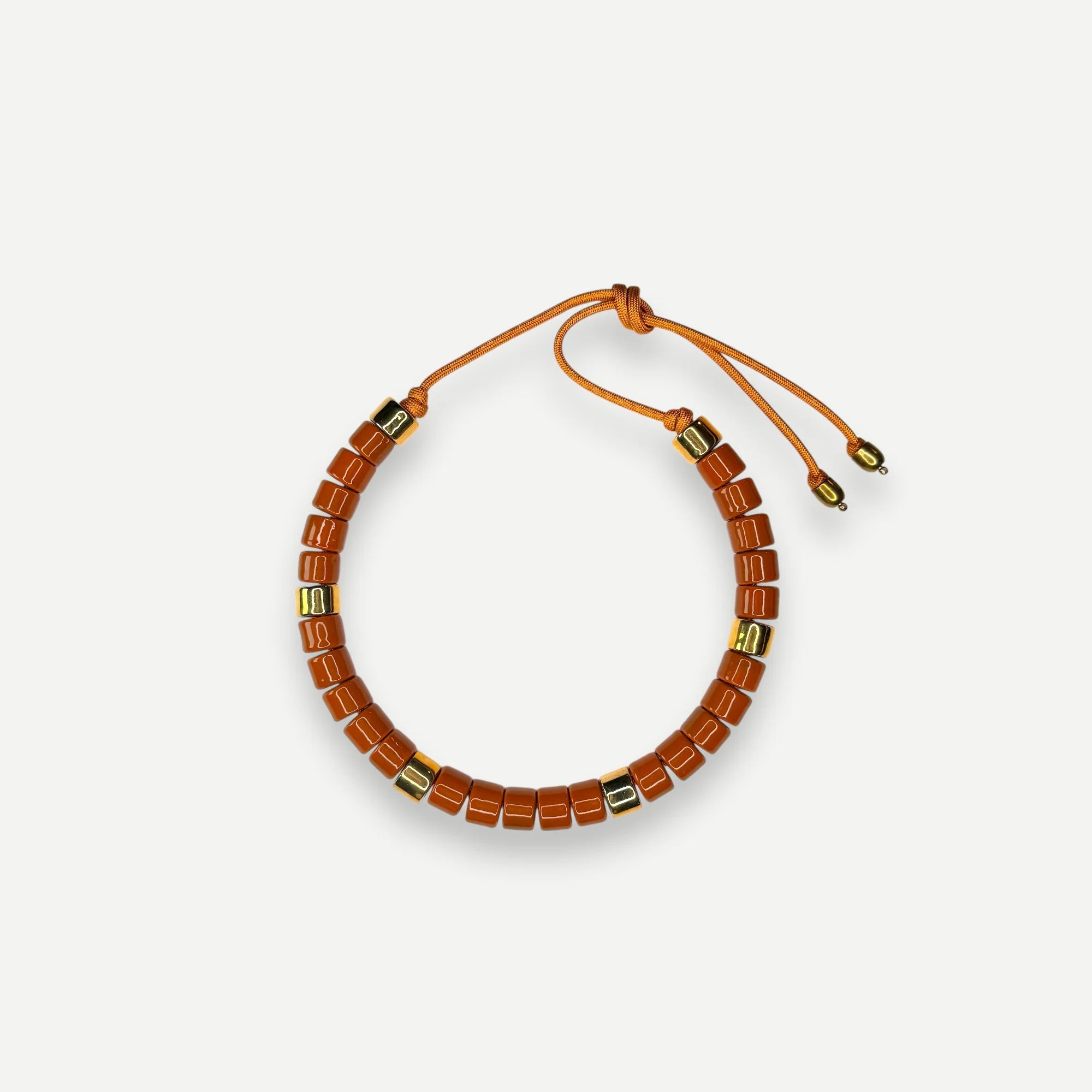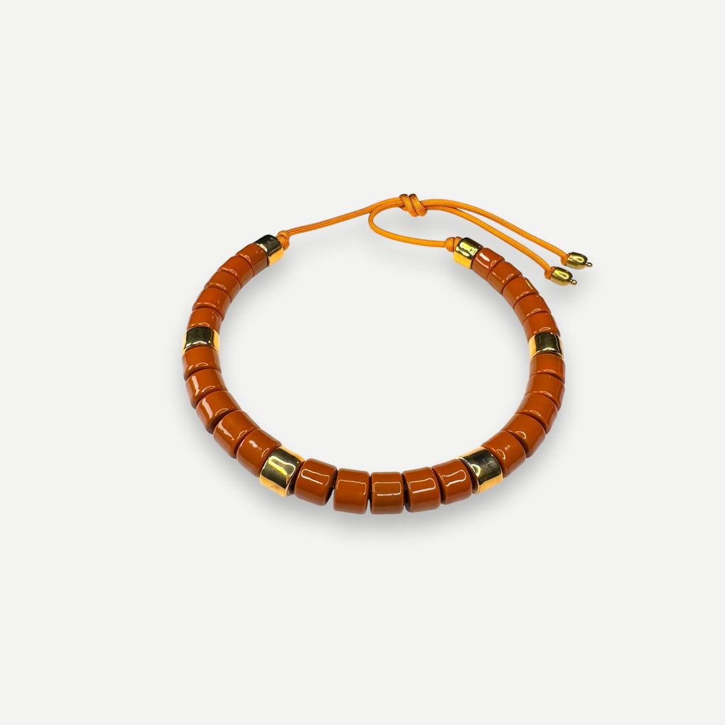 Her New Tribe is a collection of statement-making color-focused small-batch ceramic jewelry. This piece features a caramel gloss and gold metallic gloss ceramic beads on a goldenrod cord.