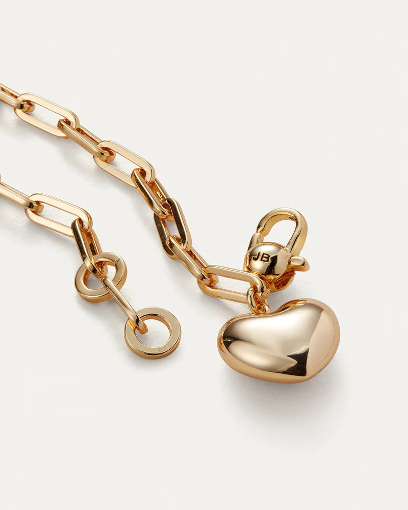 Lots to love here! This paperclip link chain bracelet is adorned with a dangling puffy heart charm. Great for layering or styling solo on your wrist.
