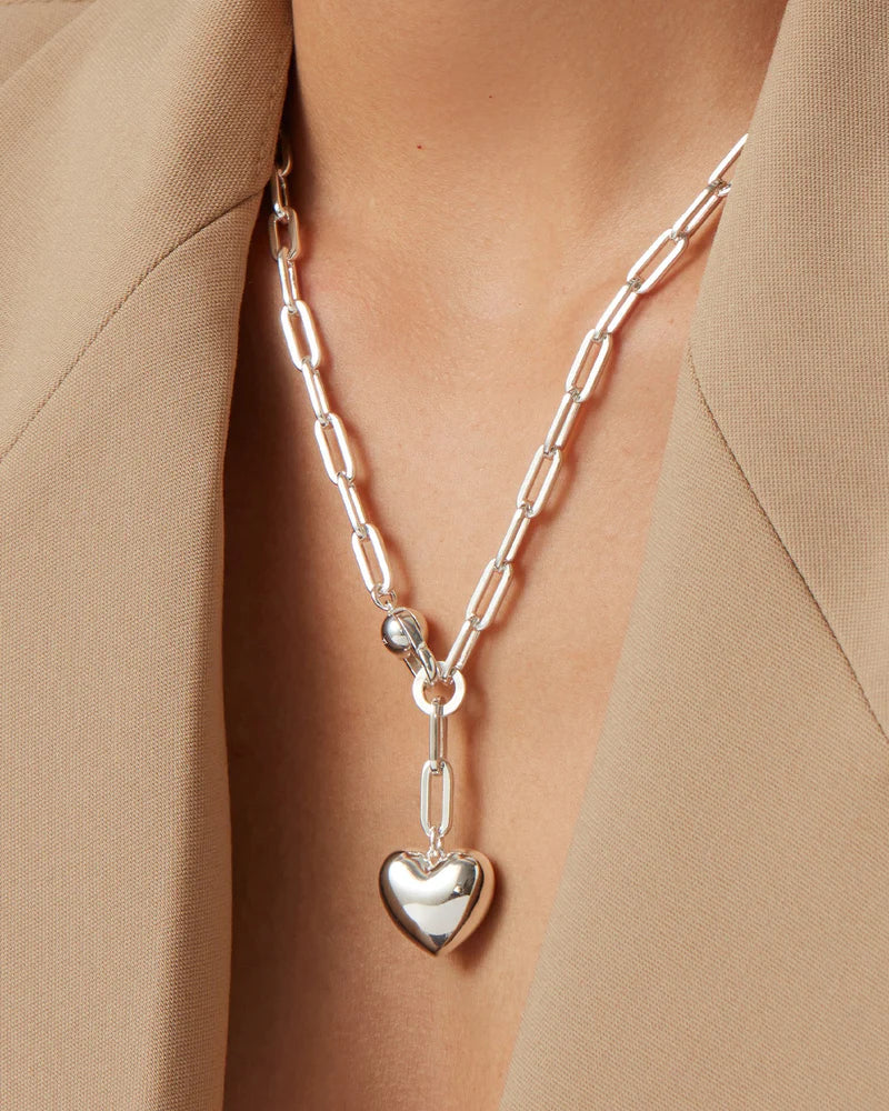 Add this fun statement piece to your jewelry box and style it to your heart's desire! A joyful, inflated heart is suspended from a paperclip link chain necklace.