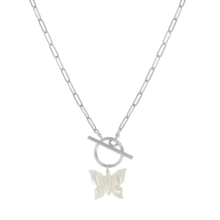 Silver necklace with hand-carved Mother of Pearl butterfly charm.