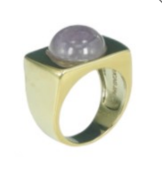 A squared gold band with an amethyst stone adds a playful touch to your look. This piece embodies sculptural elegance in a chic sense.