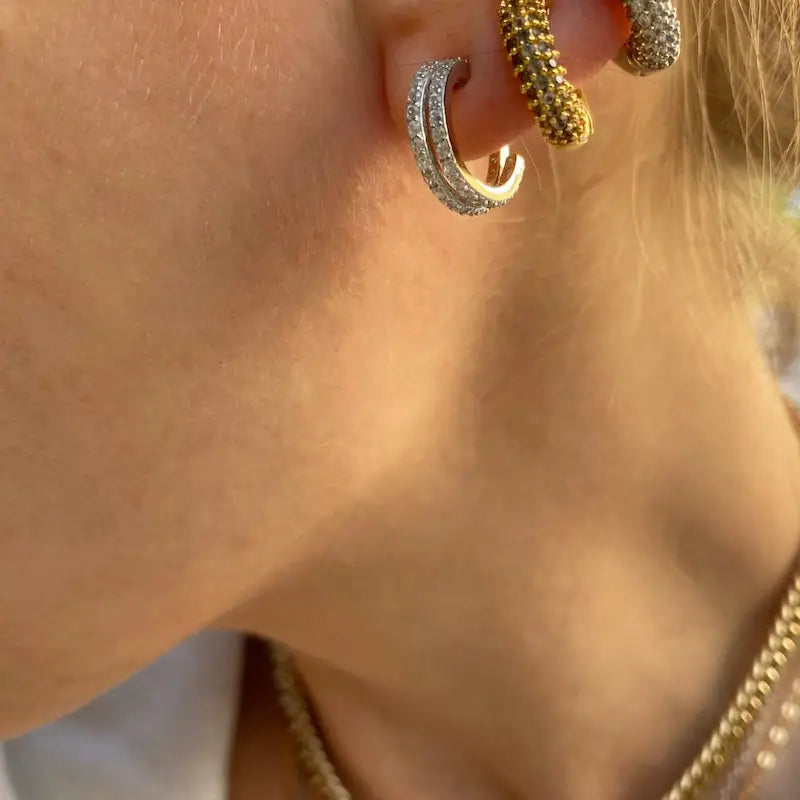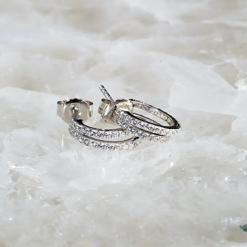 Perfect petite double huggie design in sterling silver and white cz. Your go-to for effortless, everyday edge. A classic everyday earring with a twist.