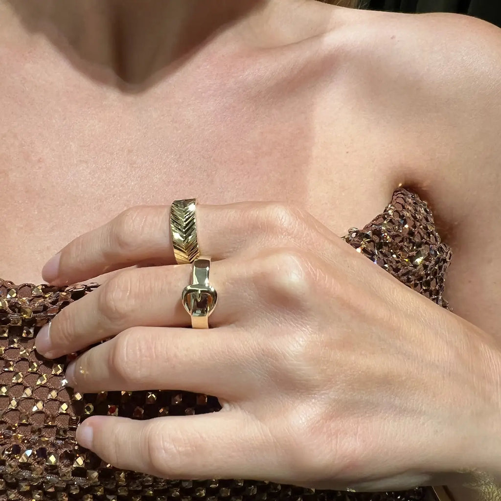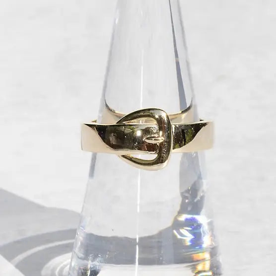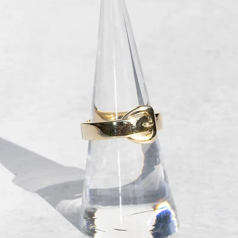 A bold twist on a classic, this yellow gold plated ring features a sleek belt buckle motif. Sculptural and statement-making, it blends modern edge with vintage-inspired charm for a standout everyday piece.