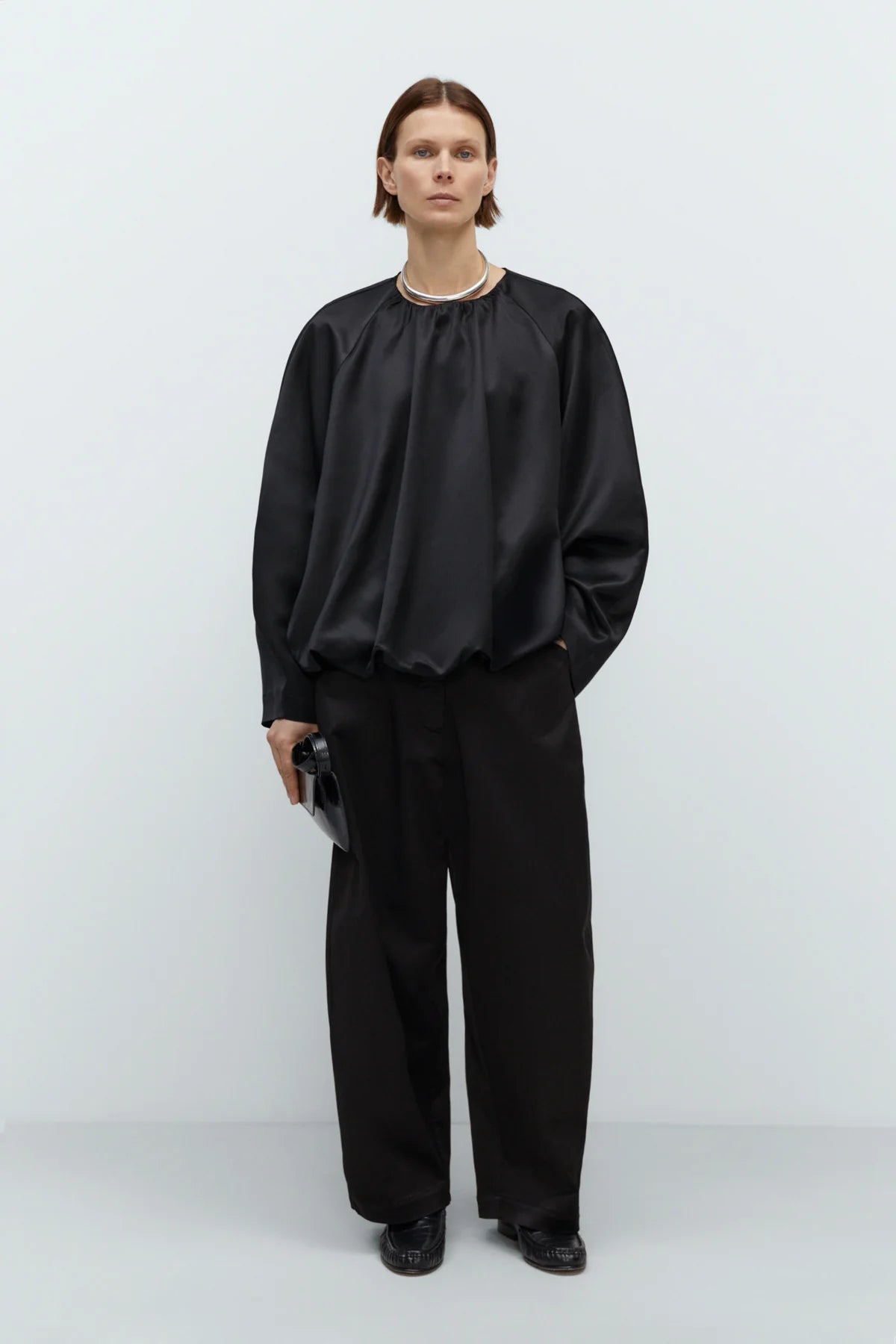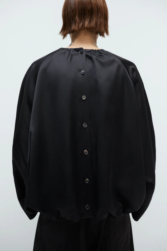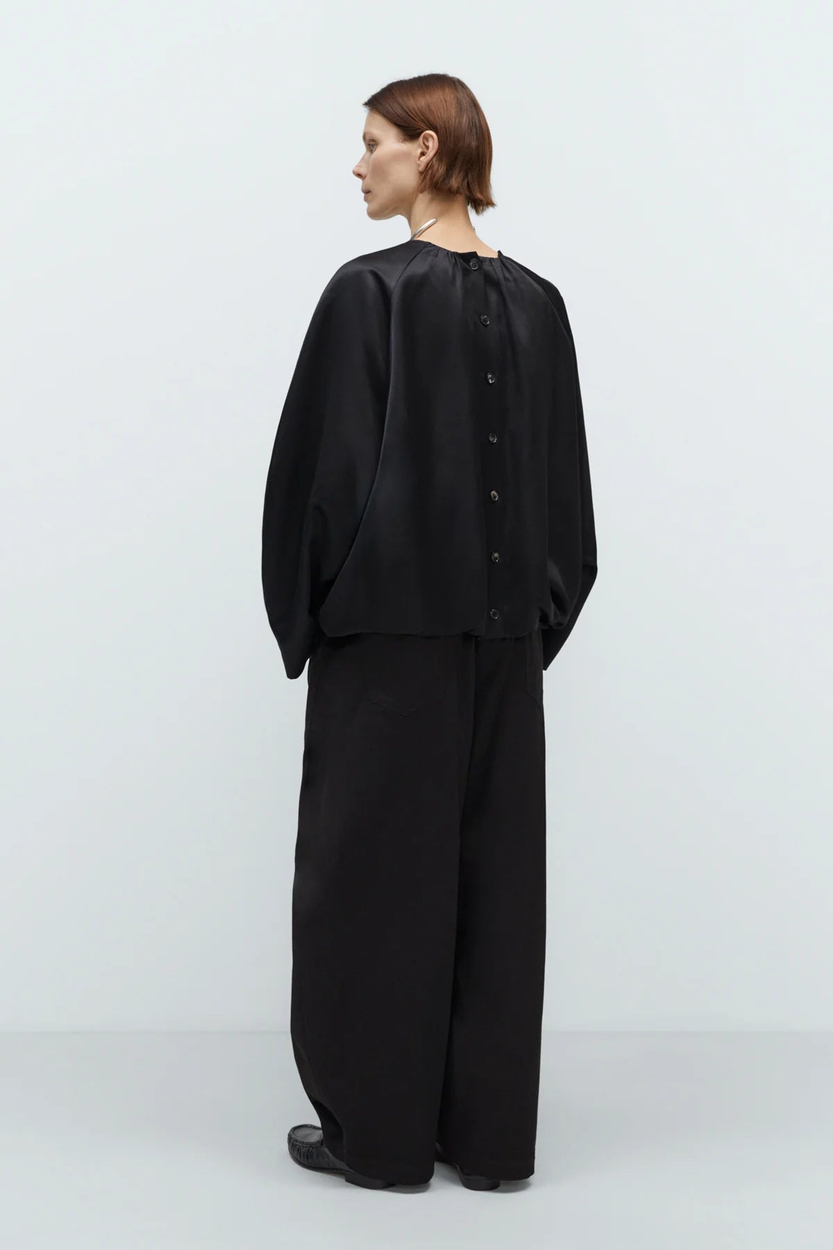 Balloon-shaped blouse with a button closure at the back and a round neckline. Hidden side pockets add functionality, while front pleats create volume for an elegant drape. Features long, balloon sleeves and an oversized fit for a relaxed, stylish look.