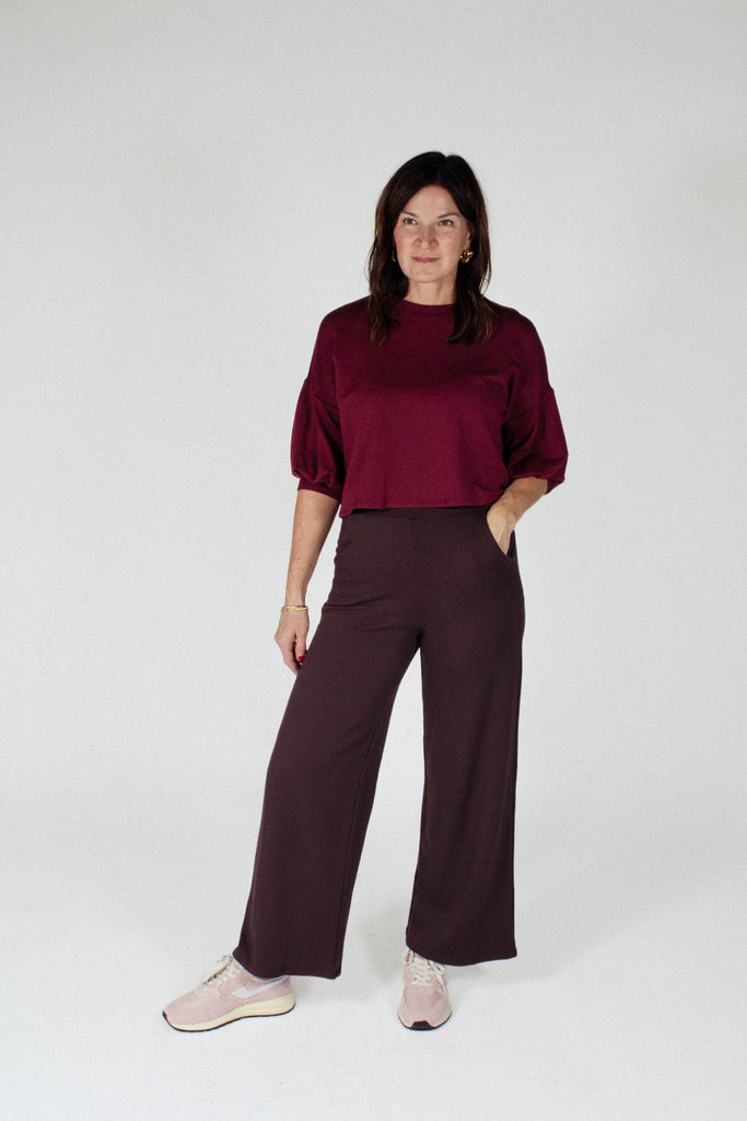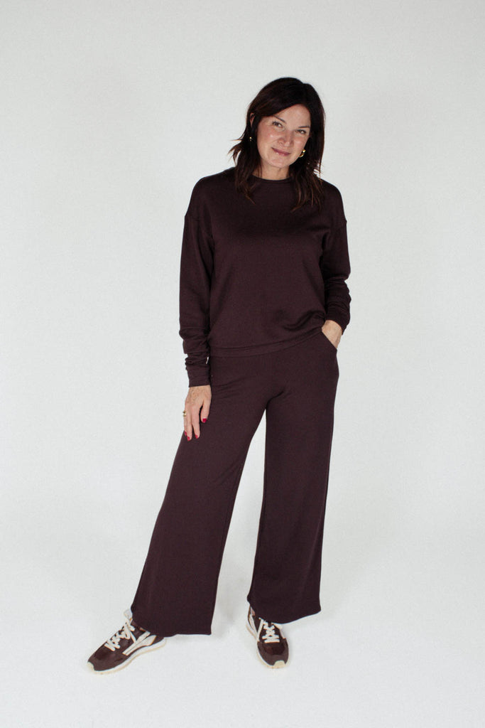 The Olivia Trouser is a flattering wide leg sweatpant with pockets. It has a 1” elastic waistband for your comfort, while also maintaining an elevated look. Made with a buttery soft (and flattering) Modal French Terry dyed and knitted in Los Angeles, CA. Each piece is cut and sewn in the Corinne studio.