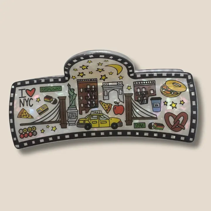 I <3 NYC!!! Inspired by the energy of New York City, this claw is made for bright lights, bold moves, and nonstop adventure. Whether you're hailing a cab at midnight, strolling through SoHo, or grabbing a late-night slice, it’s the perfect accessory to keep up with the city that never sleeps. Colorful details on a pearlescent background. Lightweight and durable design makes styling effortless from day to night.