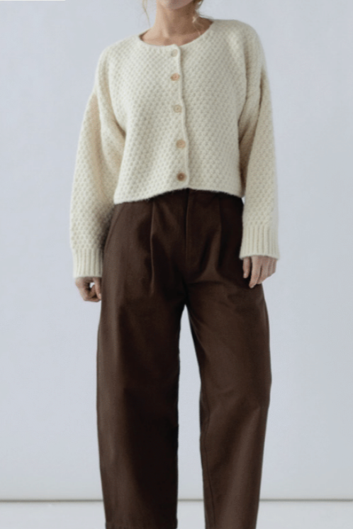 Crewneck style textured knit cardigan with slightly billowed sleeves.