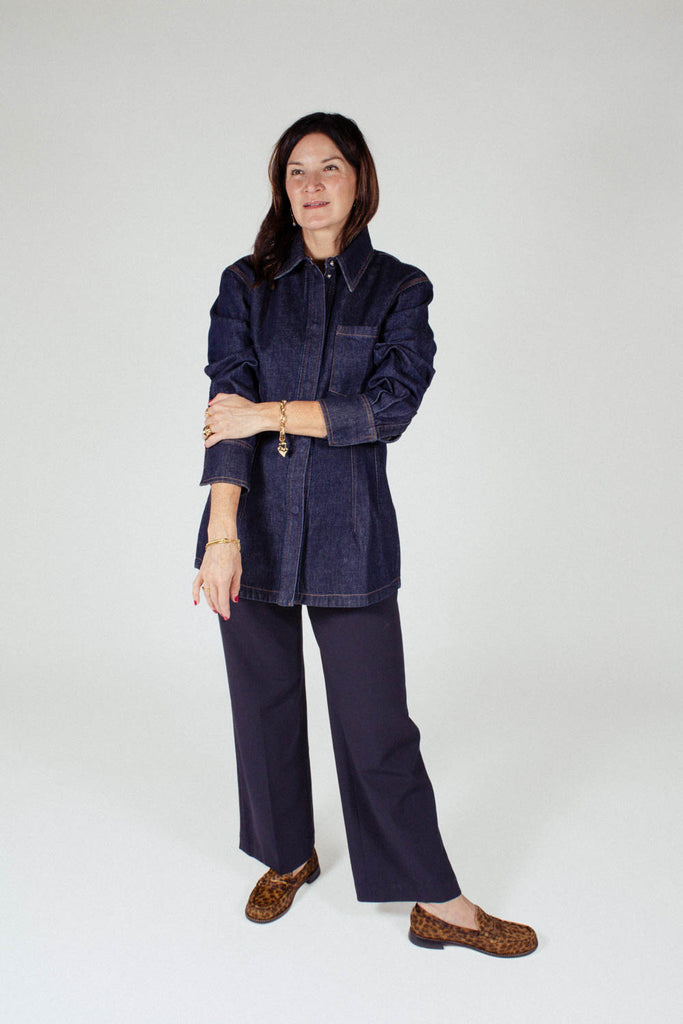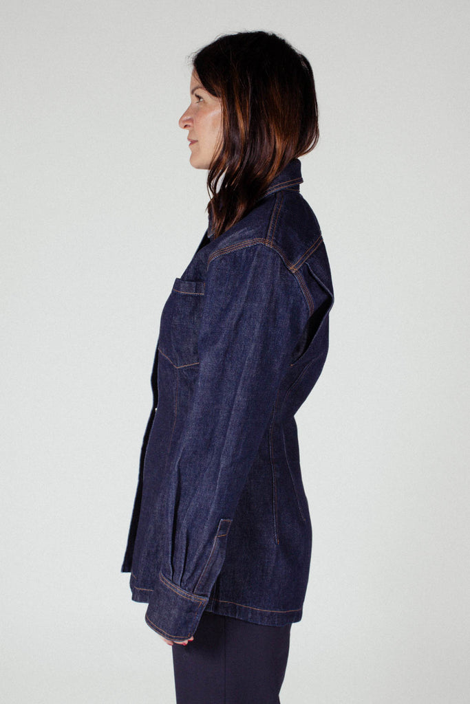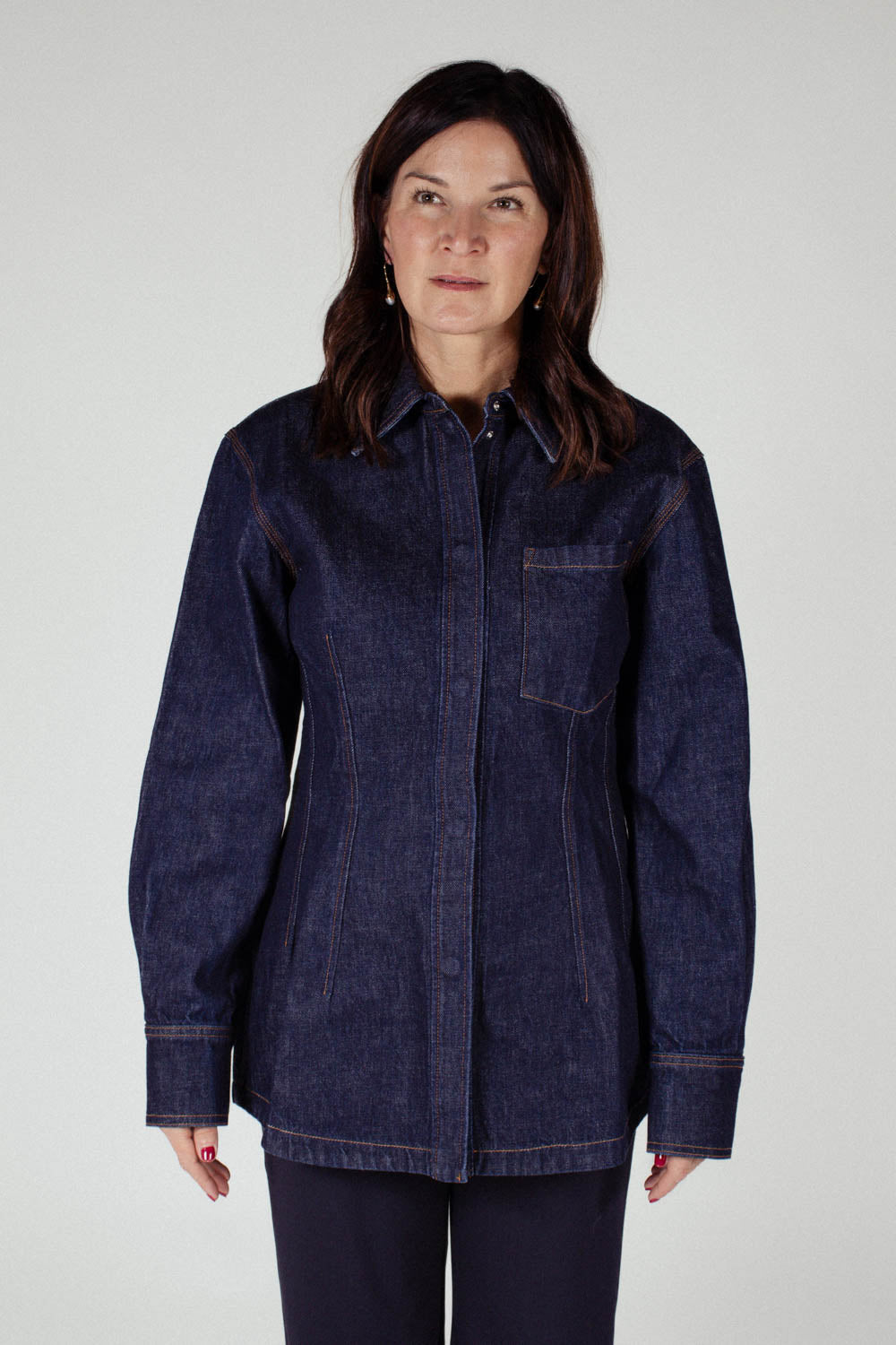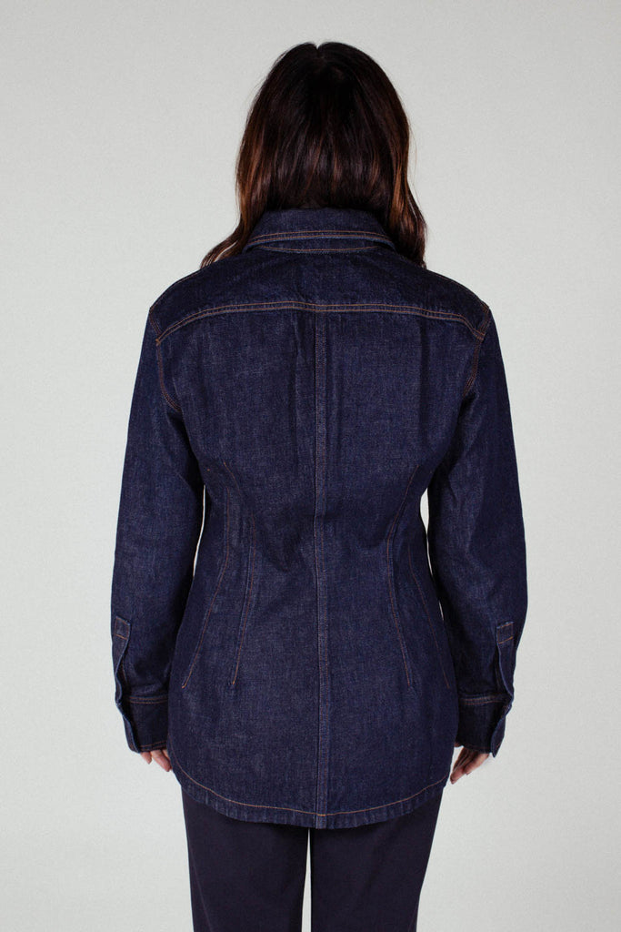 Tailored long-sleeve top with a classic collar and concealed button front, cut in raw wash Mission Denim. Dart construction creates an hourglass shape. Features contrast stitching and a single chest patch pocket. Made in Los Angeles using premium Japanese denim. Each style is crafted in limited quantities in partnership with small, family-run factories.