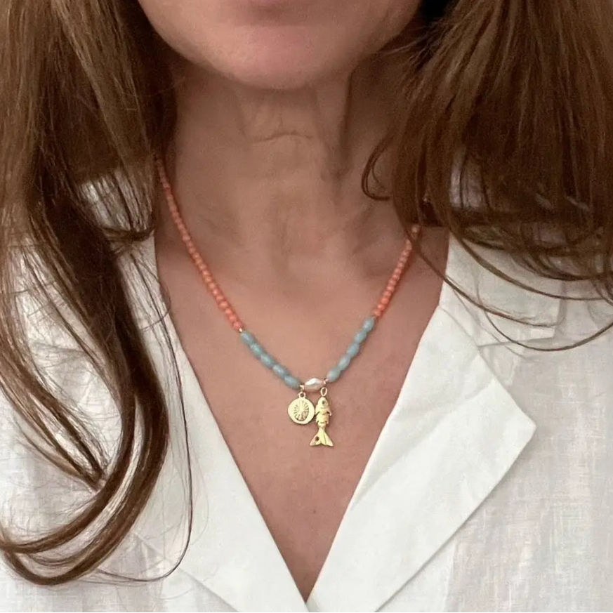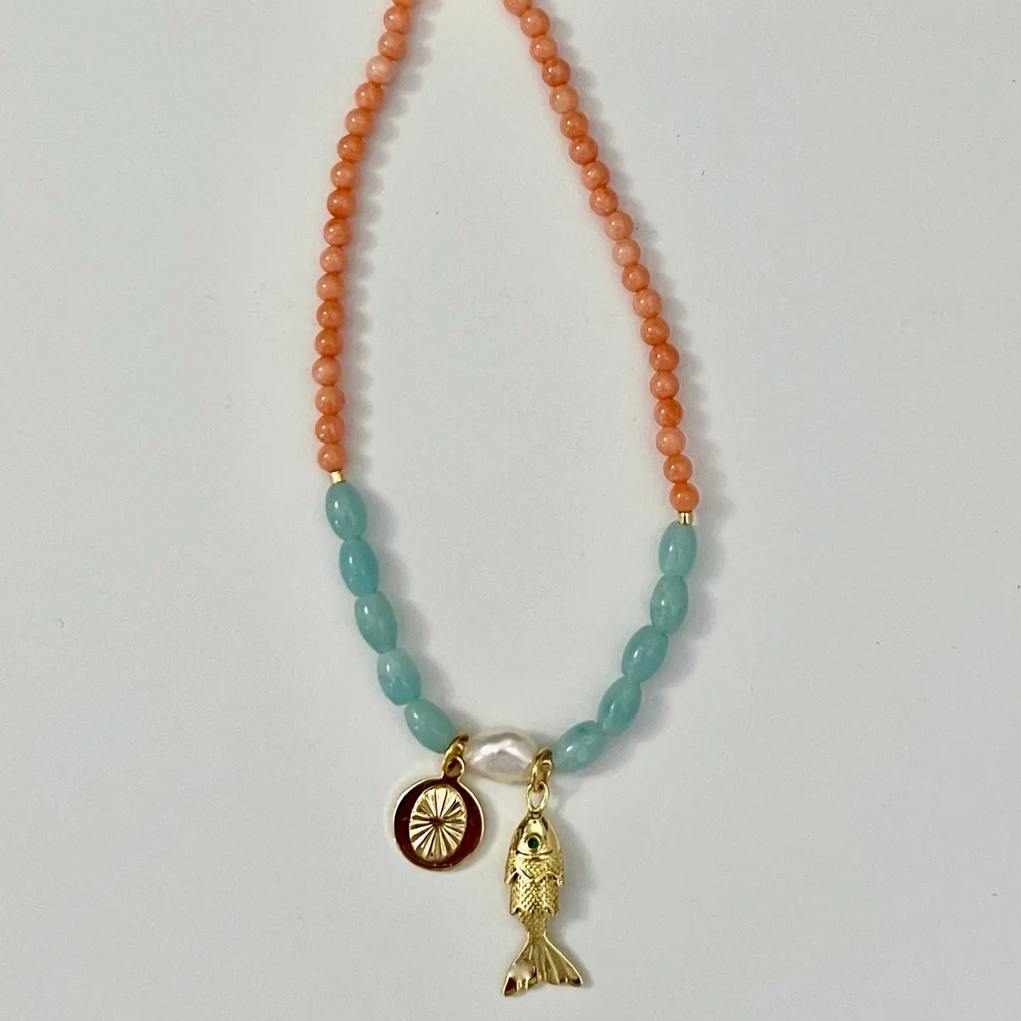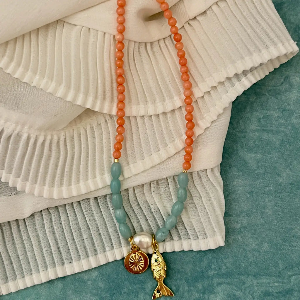 The Cora Necklace features Bamboo Coral and Amazonite arranged in a balanced color block design, highlighted by a central pearl. It is adorned with two delicate charms: a tiny medallion and an articulated fish with a striking green eye!