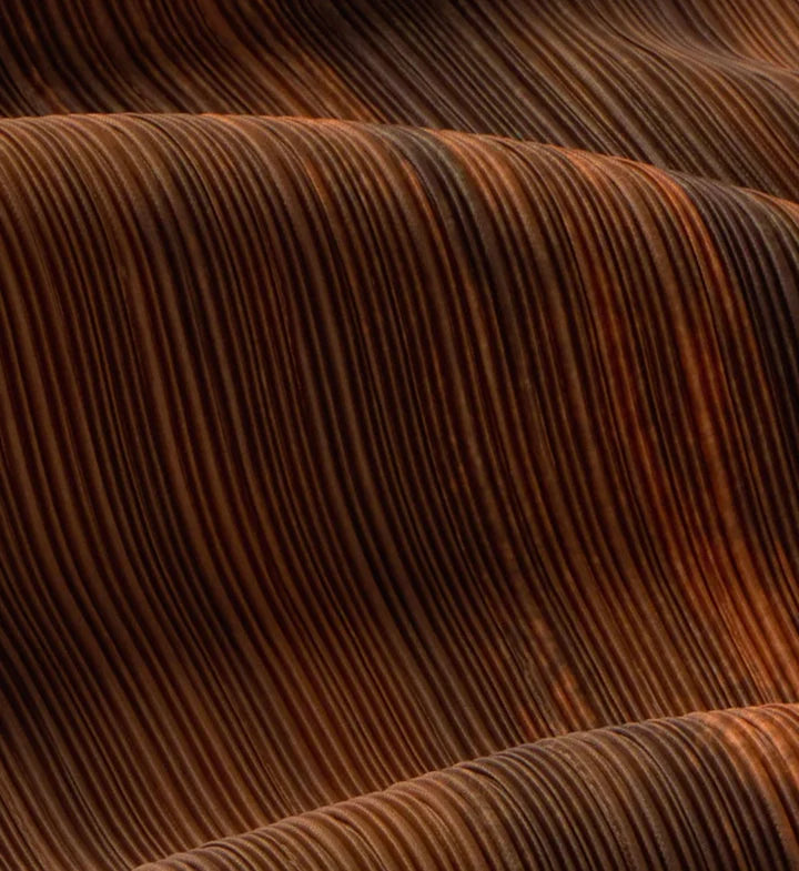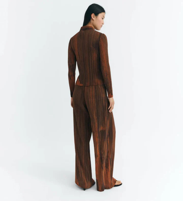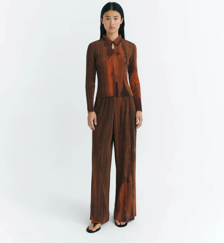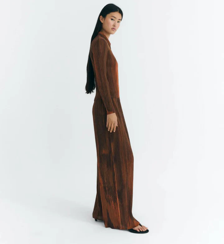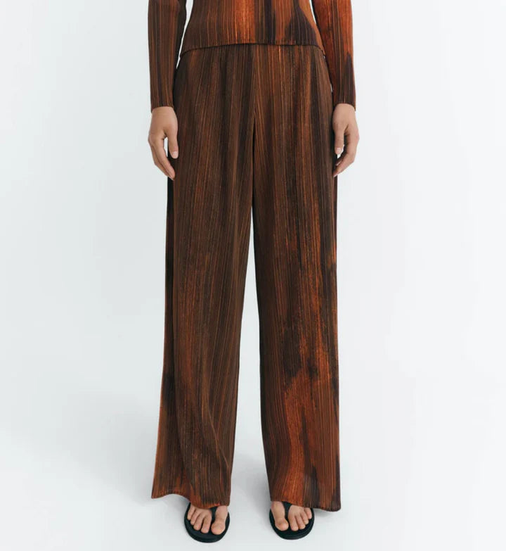Orange relaxed pleated Maro pants made of recycled polyester. The Maro pants are a flowy wide leg with a stretchy elastic waistband for your comfort. Style with anything from tees, blouses, or the coordinating Agostina top.