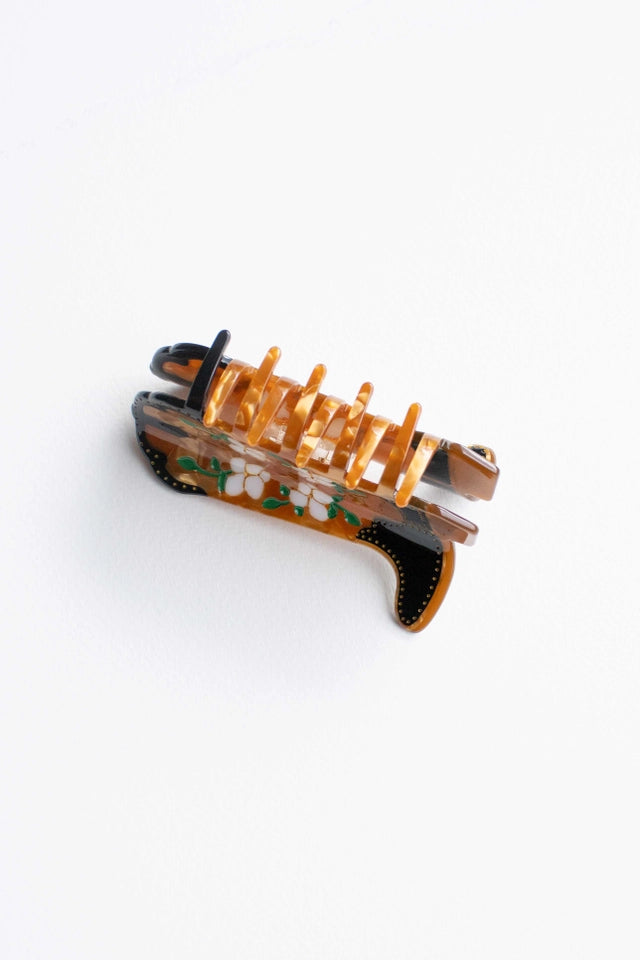 Add a playful western twist to your hairstyle with the Eco Acetate Cowboy Boot Hair Clip. Each clip is crafted from eco-friendly acetate and hand-painted with charming white floral details and gold accents. Its sturdy claw grip keeps your hair secure while making a bold statement. Available in multiple colorways, these clips are perfect for adding a touch of vintage western style to everyday looks, festivals, or gifting.