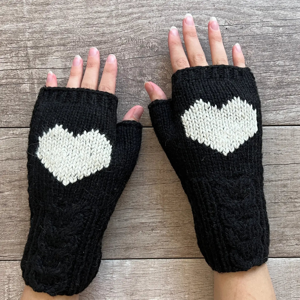 Ella Sussman - Fleece Lined Alpaca Fingerless Gloves (Black/White Heart)