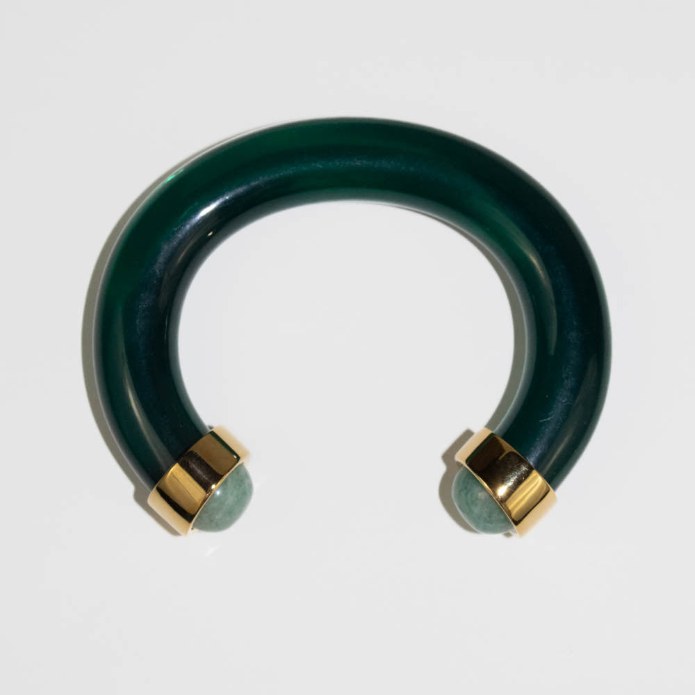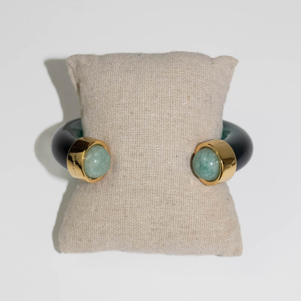An eye catching emerald green cuff adorned with amazonite stones and gold accents.