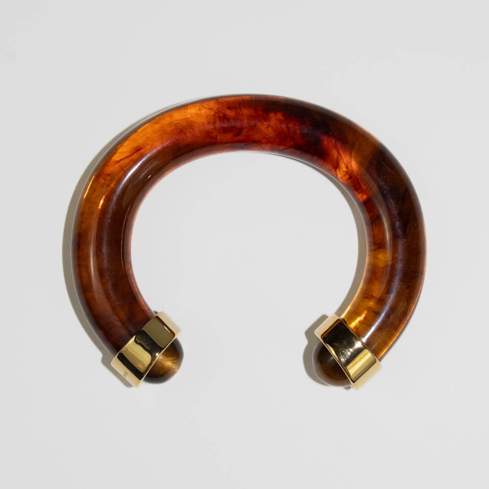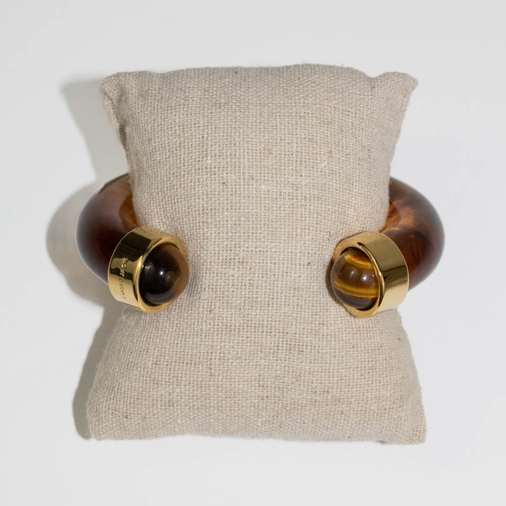 An eye catching tortoise shell resin cuff adorned with tiger eye stones and gold accents.