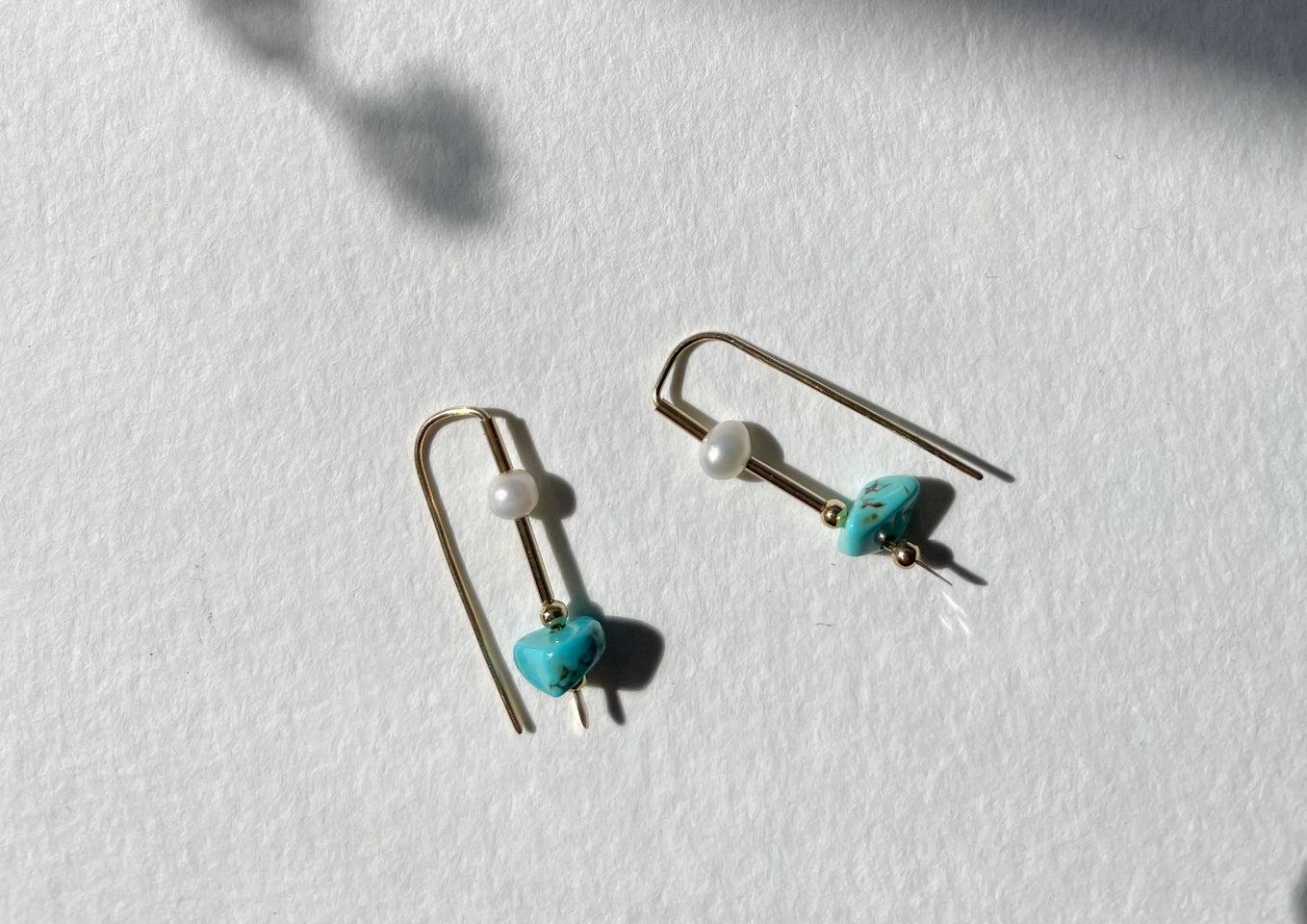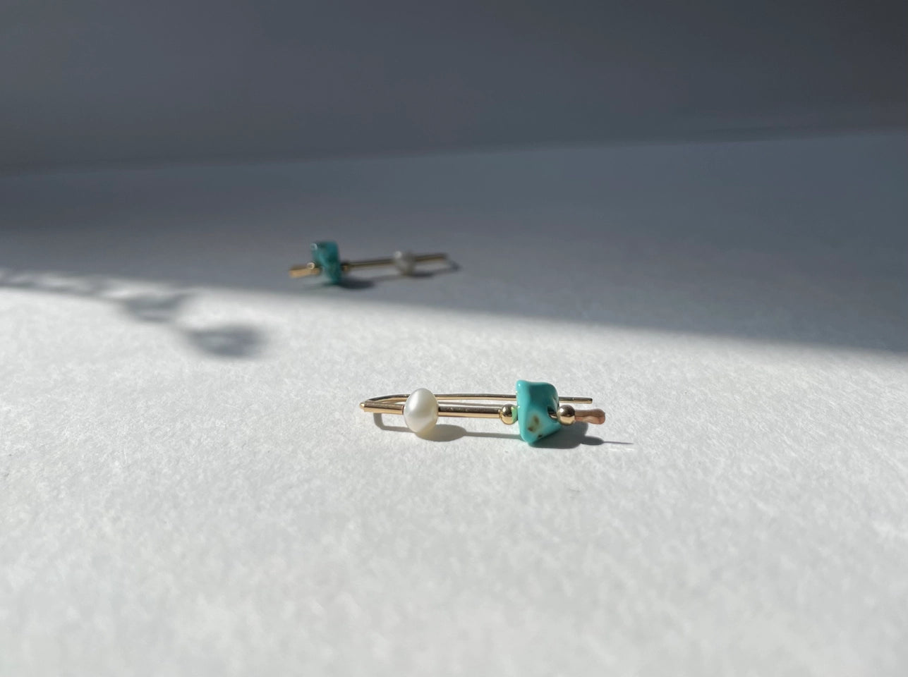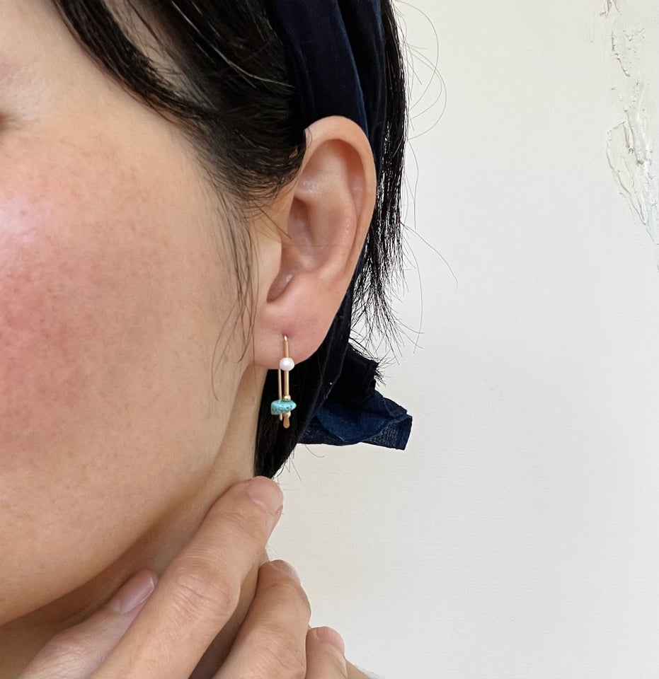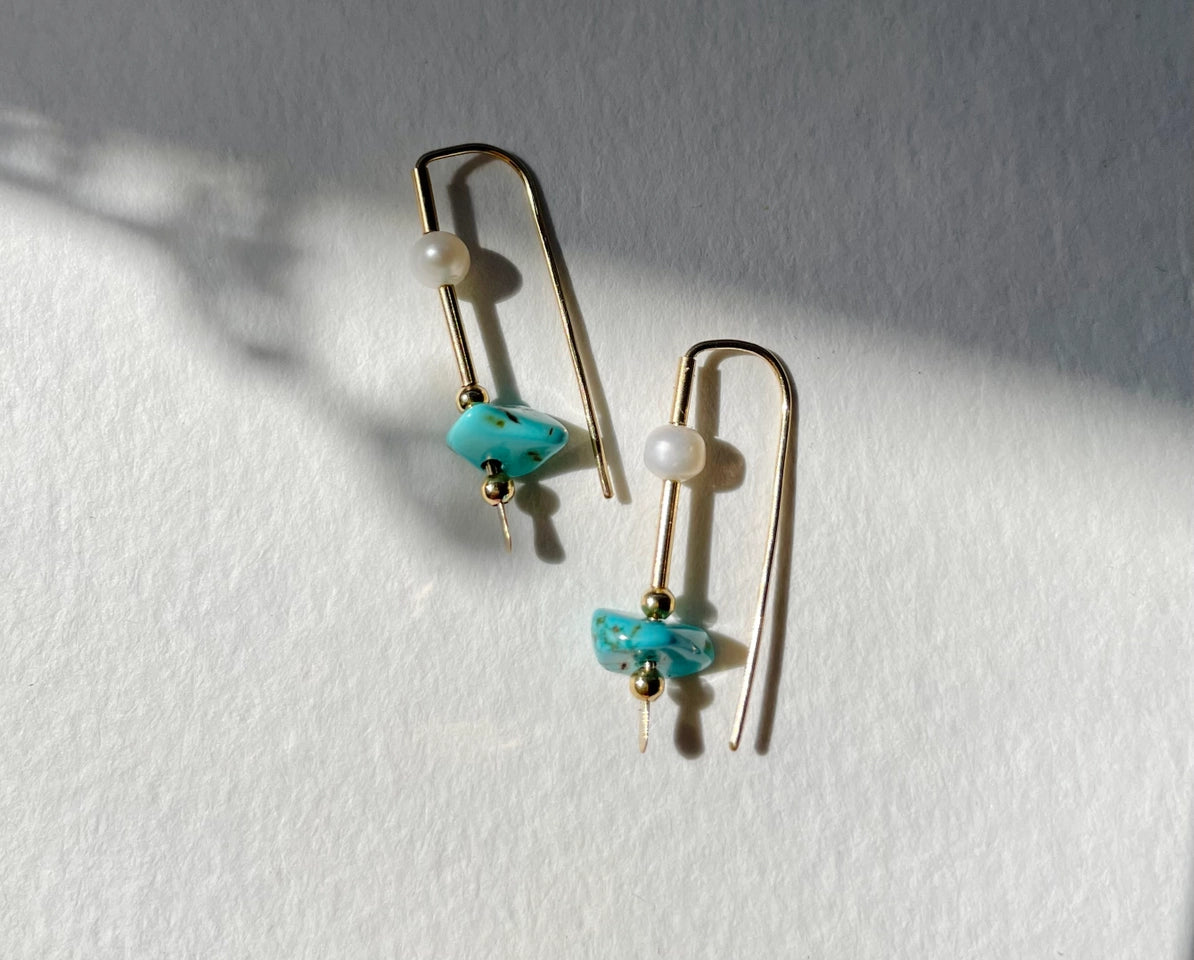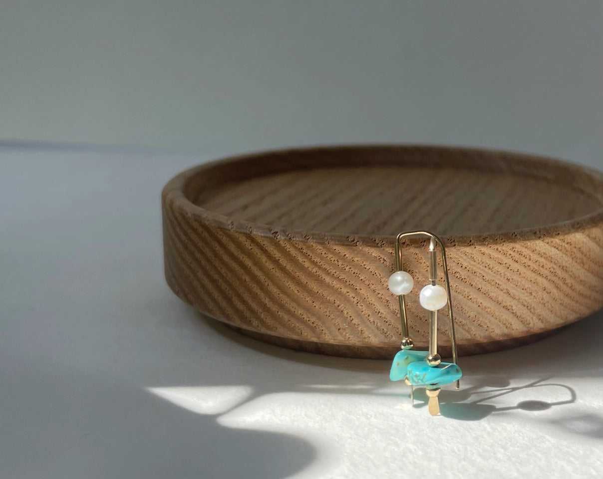 A reverie of land and sea. Earth element turquoise and water element freshwater pearl come together to represent the balance in nature. Yin and Yang.