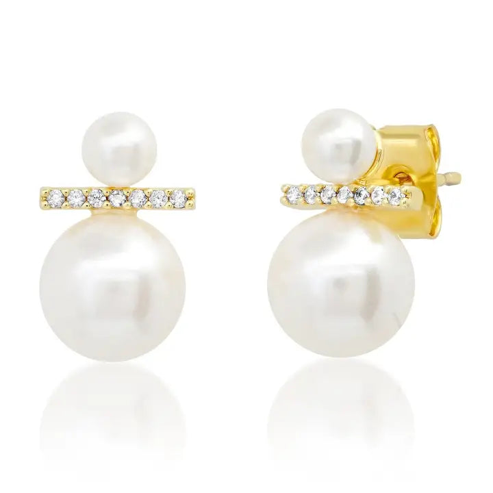 Tai - Double Swarovski Pearl and Cz Modern Studs (Gold)
