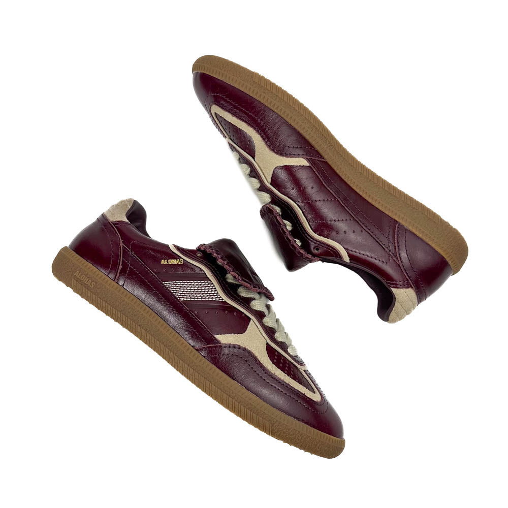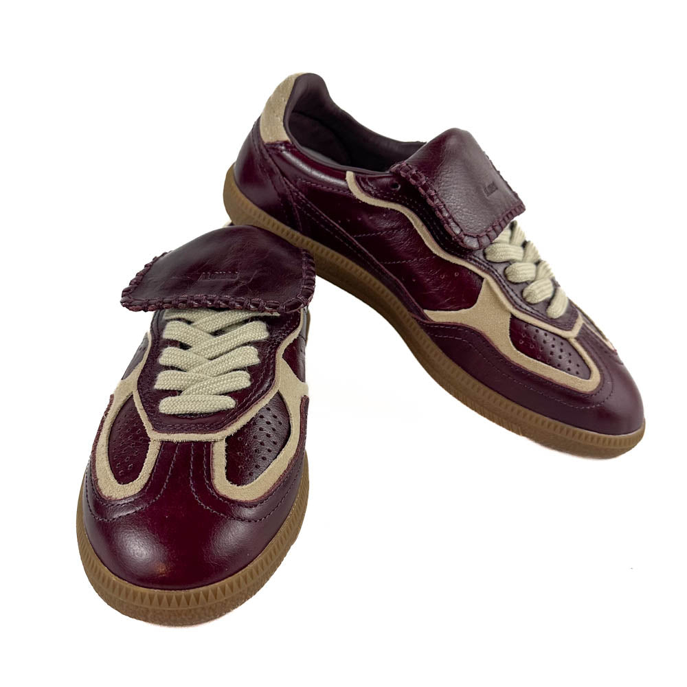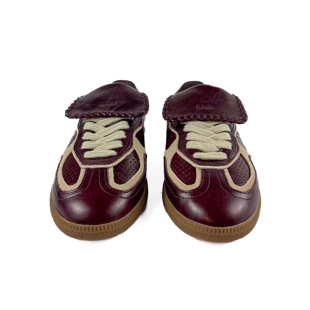 The Tb.490 Club, featuring a long tongue that folds over the vamp, reminiscent of classic soccer shoes. These sneakers are crafted from burgundy patent leather traced with contrast cream trims. Designed in a low-top silhouette sitting on rubber soles, it’s complete with classic features, including exposed stitching and the logo embossed across the tongue and sides.