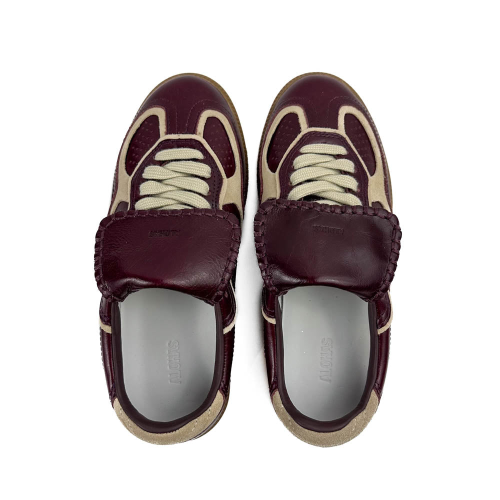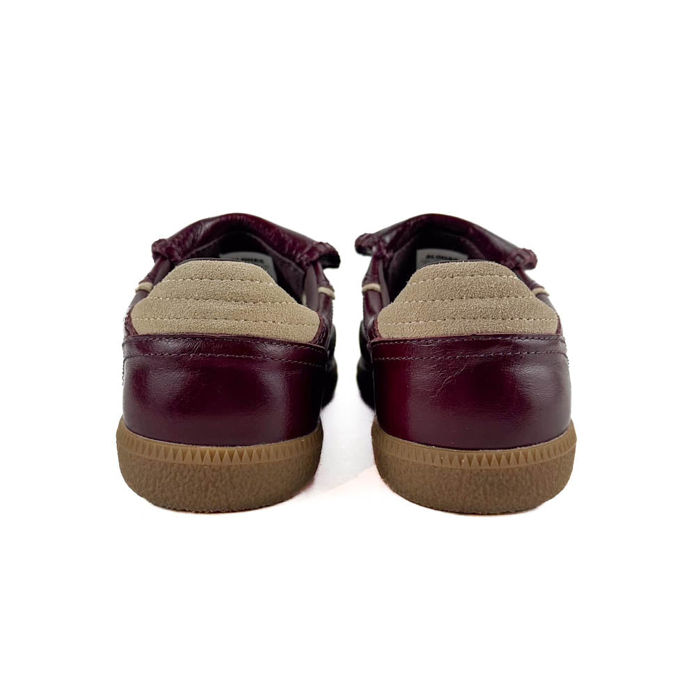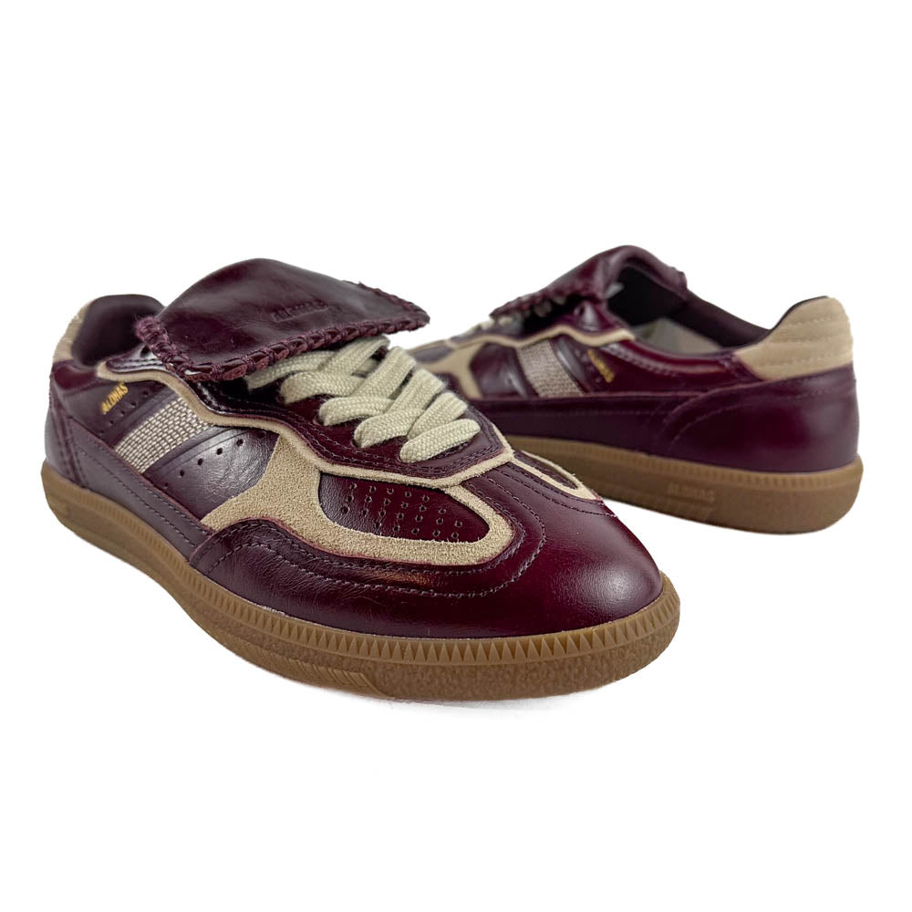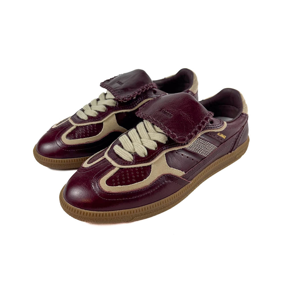 The Tb.490 Club, featuring a long tongue that folds over the vamp, reminiscent of classic soccer shoes. These sneakers are crafted from burgundy patent leather traced with contrast cream trims. Designed in a low-top silhouette sitting on rubber soles, it’s complete with classic features, including exposed stitching and the logo embossed across the tongue and sides.