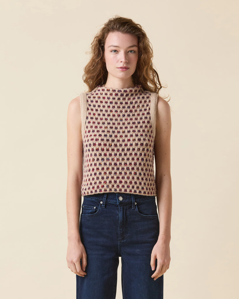 This honeycomb knit vest highlights pockets of colors that complement your fall wardrobe. Made in a relaxed fit with a slight funnel neck.