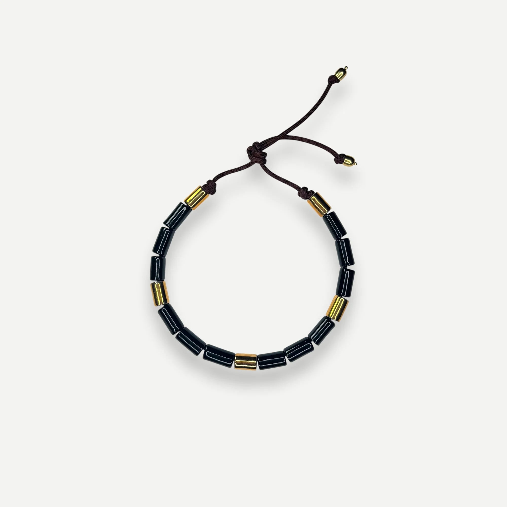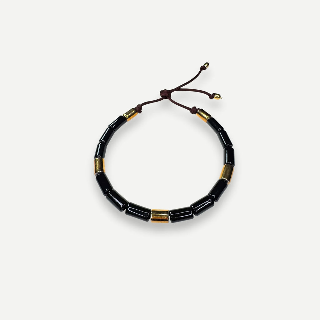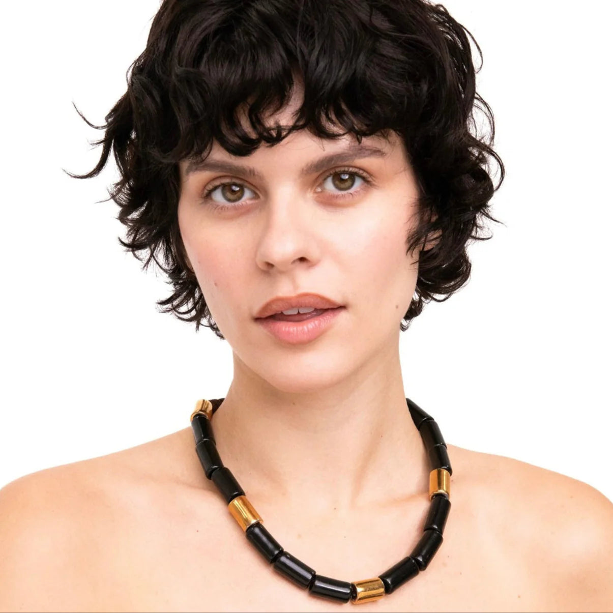 Her New Tribe is a collection of statement-making color-focused small-batch ceramic jewelry. This piece features black gloss and gold gloss beads on cherry cola cord.