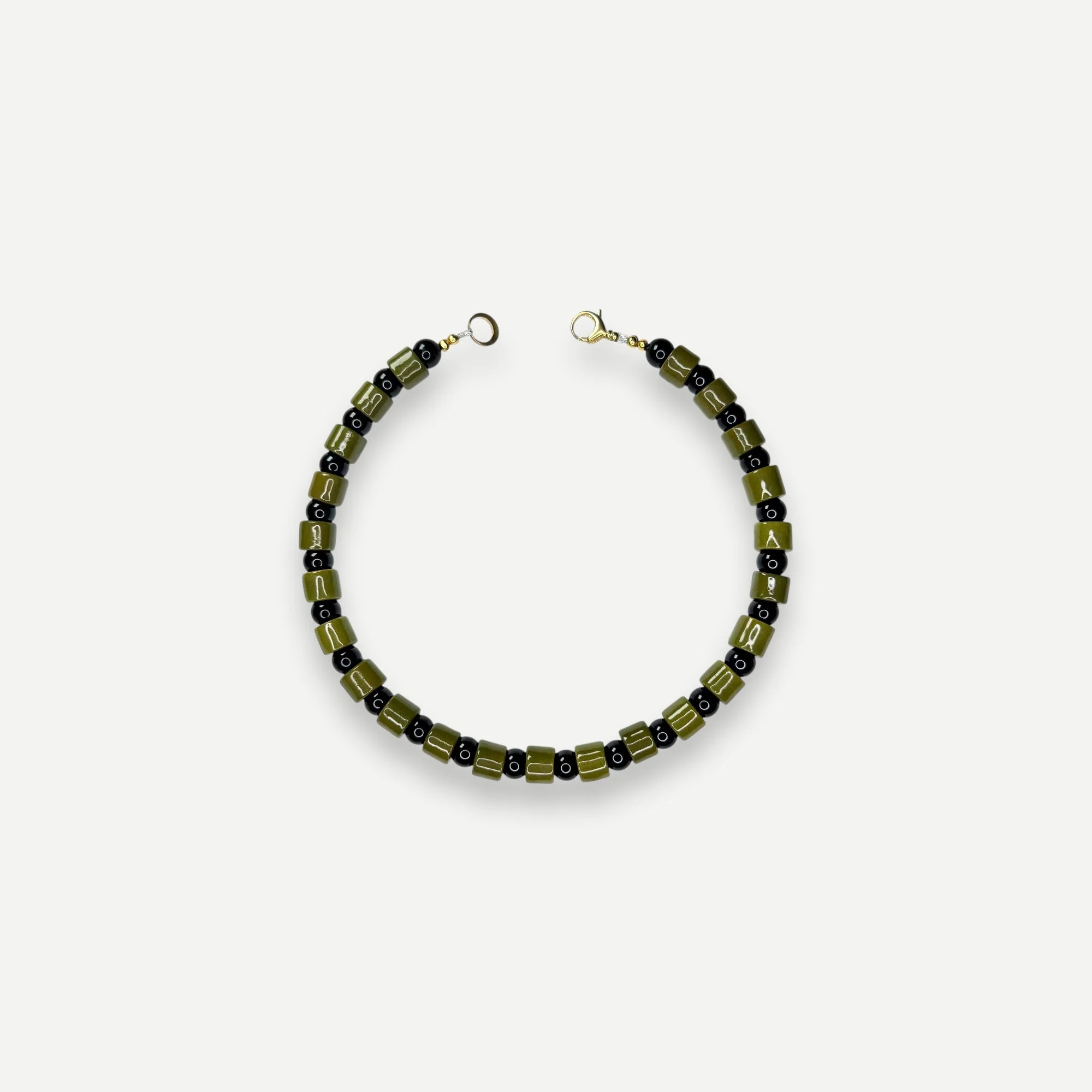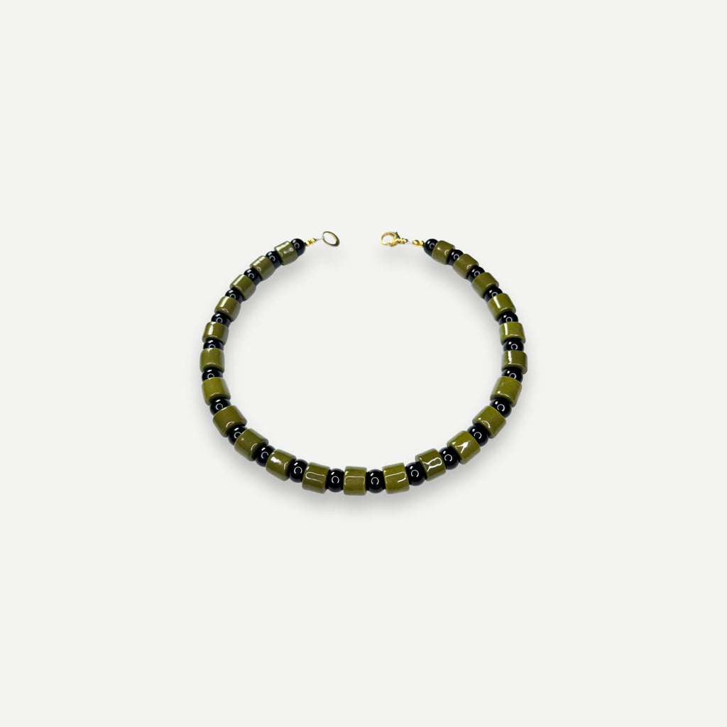 Her New Tribe is a collection of statement-making color-focused small-batch ceramic jewelry. This piece features army green gloss and onyx beads.