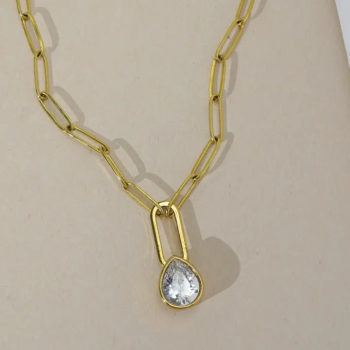 Golden glow meets timeless sparkle in this gold link bezel necklace, finished with a teardrop bezel-set cubic zirconia that catches the light with every move.