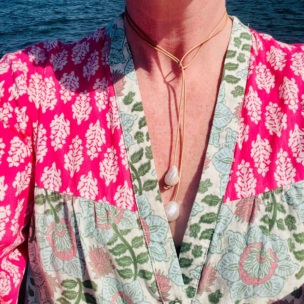 - Two fresh water pearls strung on a 33 inch leather cord.