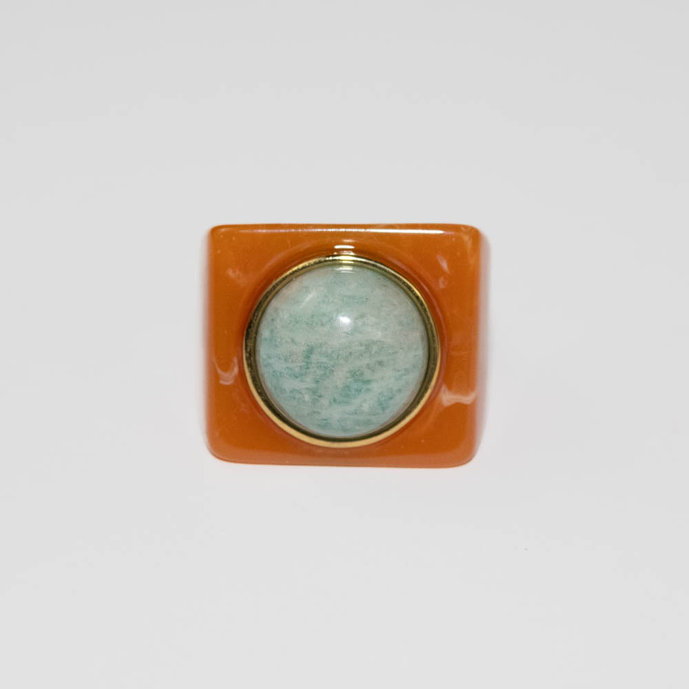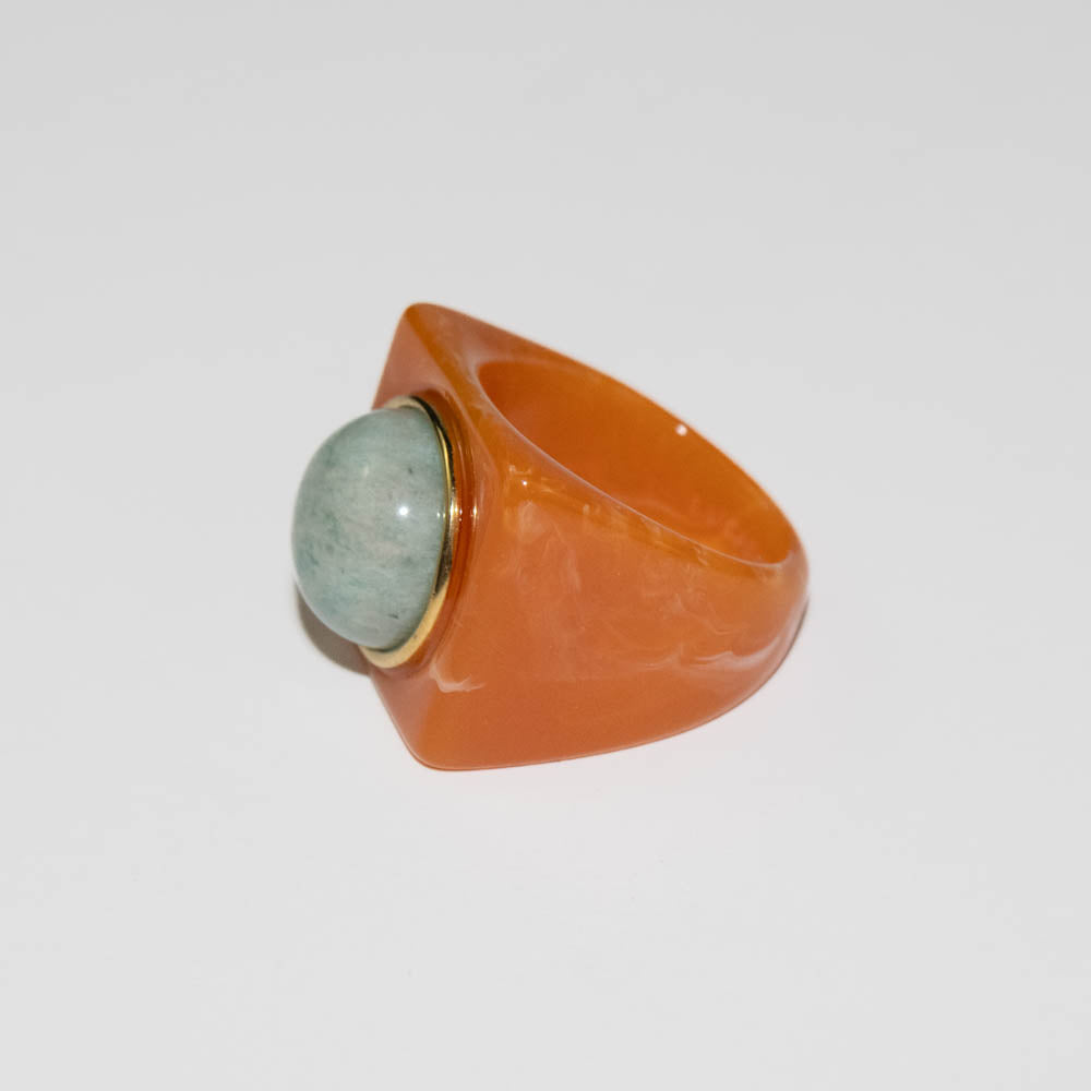 Apricot resin square shaped ring with an amazonite stone and gold accent.