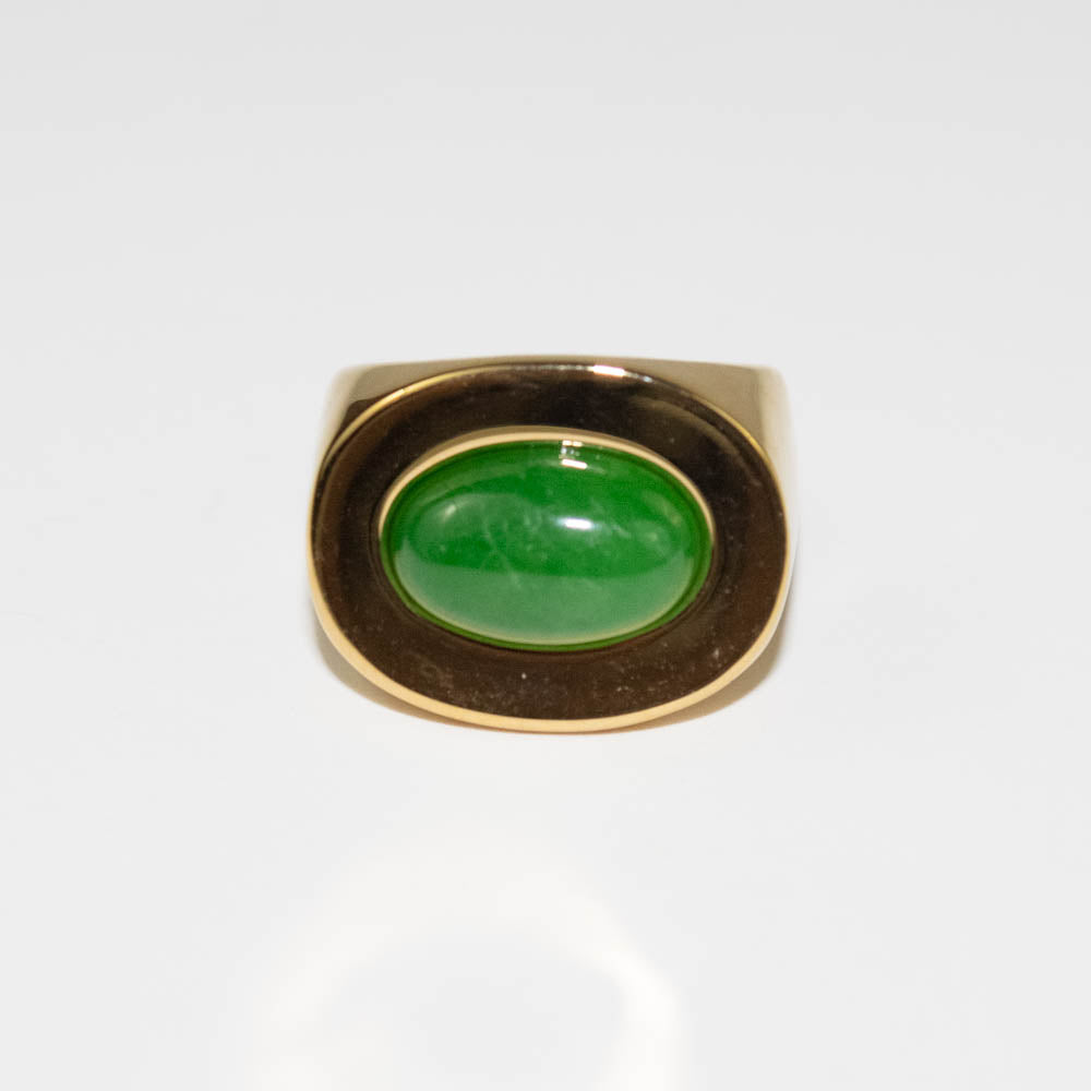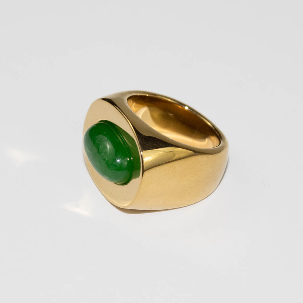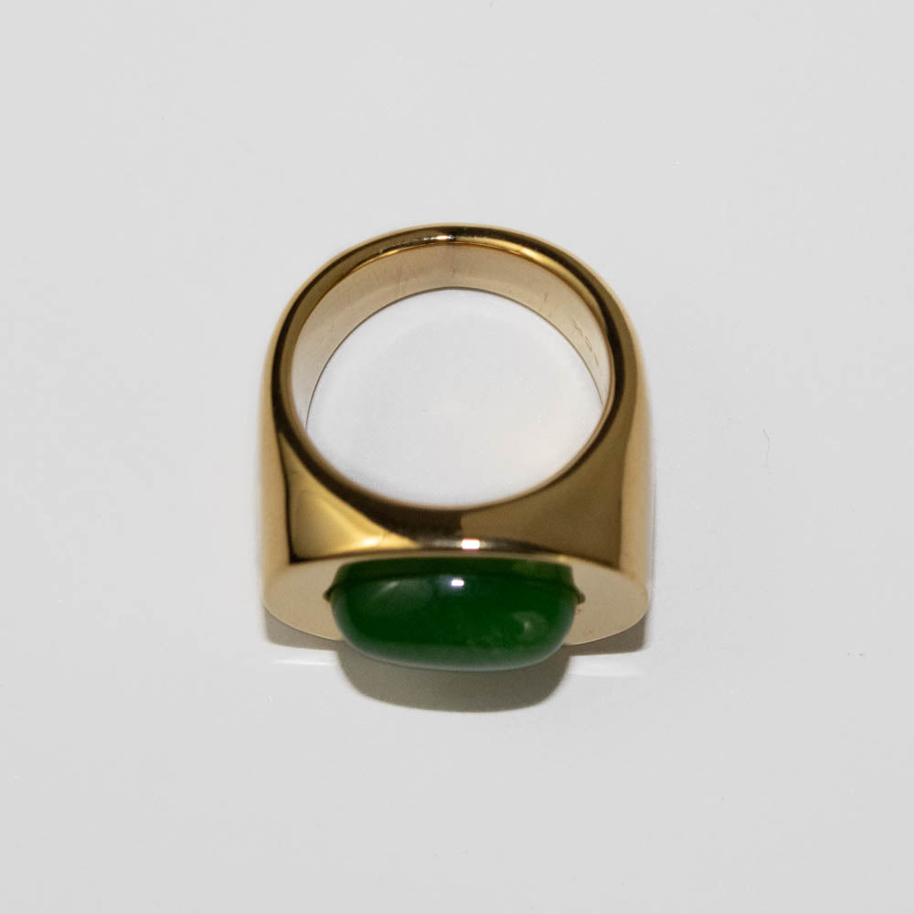 A gold band with a green quartz stone adds a playful touch to your look. This piece embodies sculptural elegance with a chic sense.