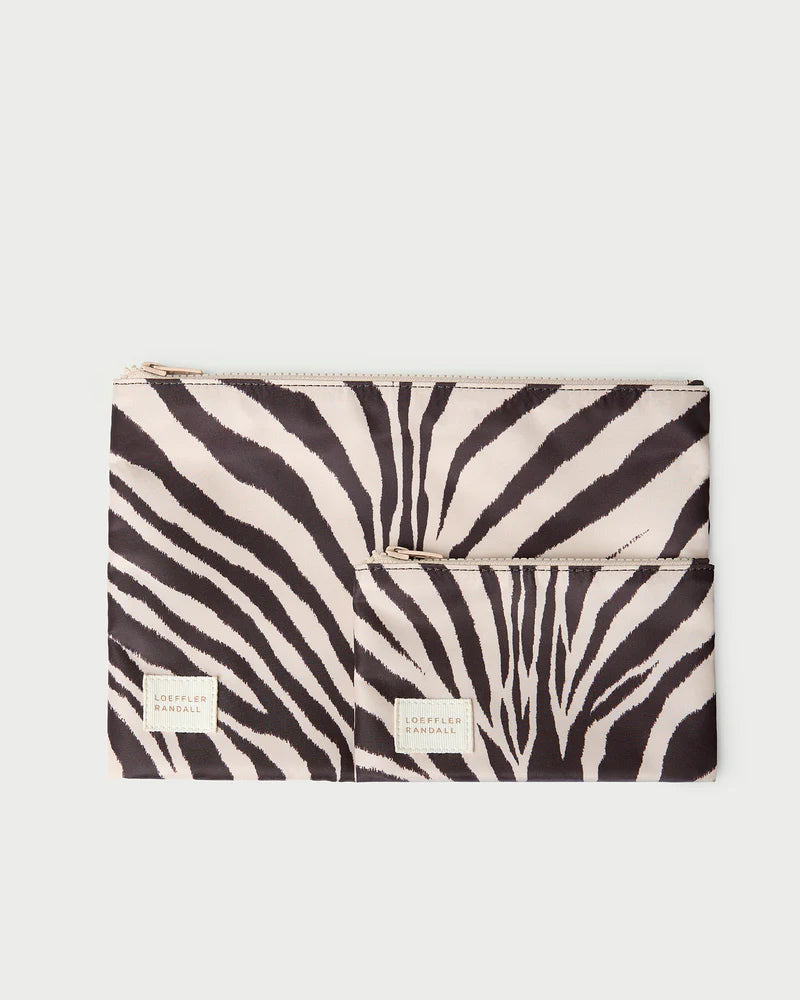 Set of two nylon pouches in cream zebra nylon. Each features an exterior cotton logo and top zip closures, making them perfect for travel.