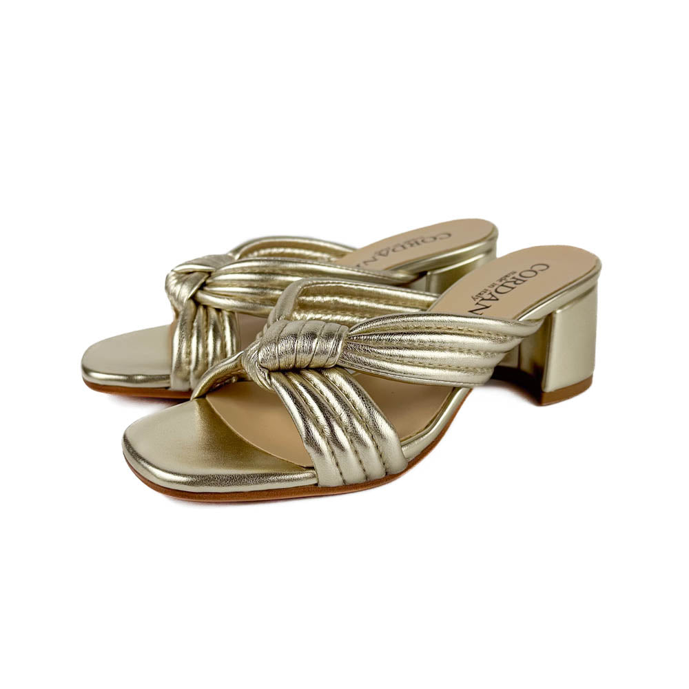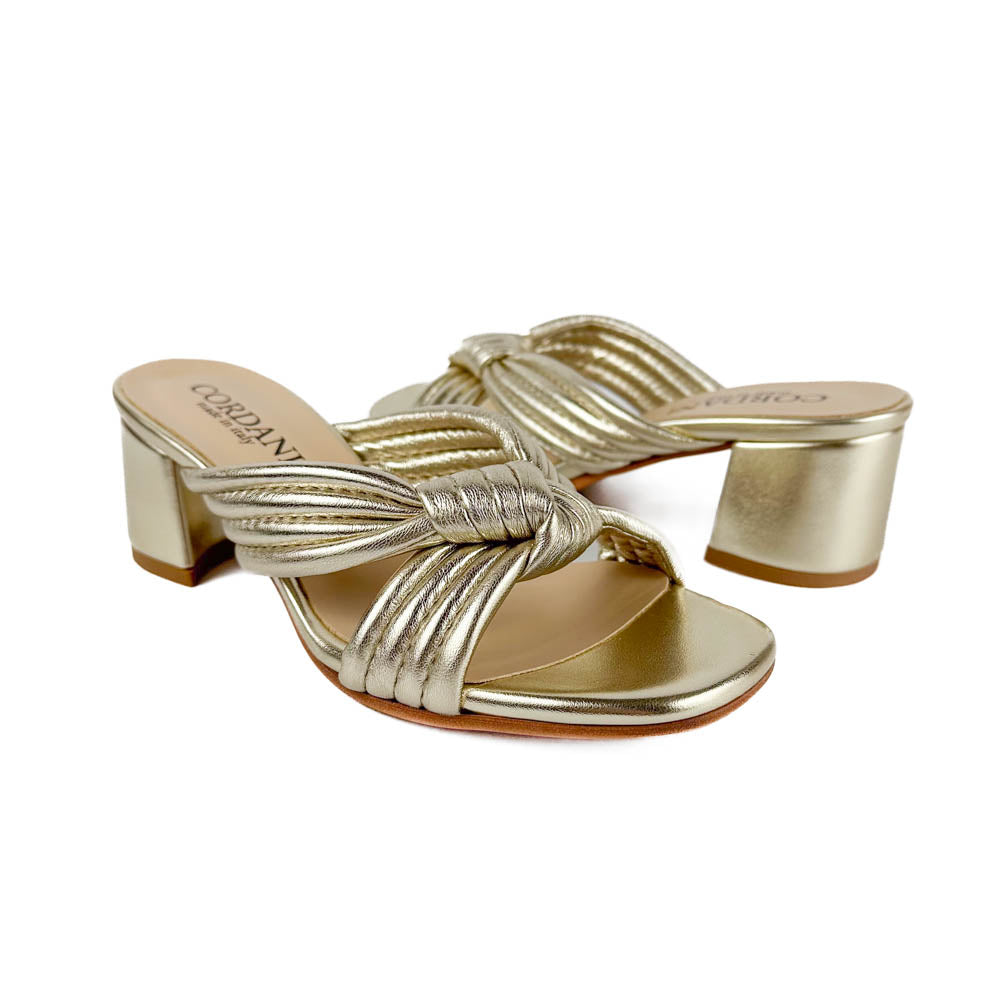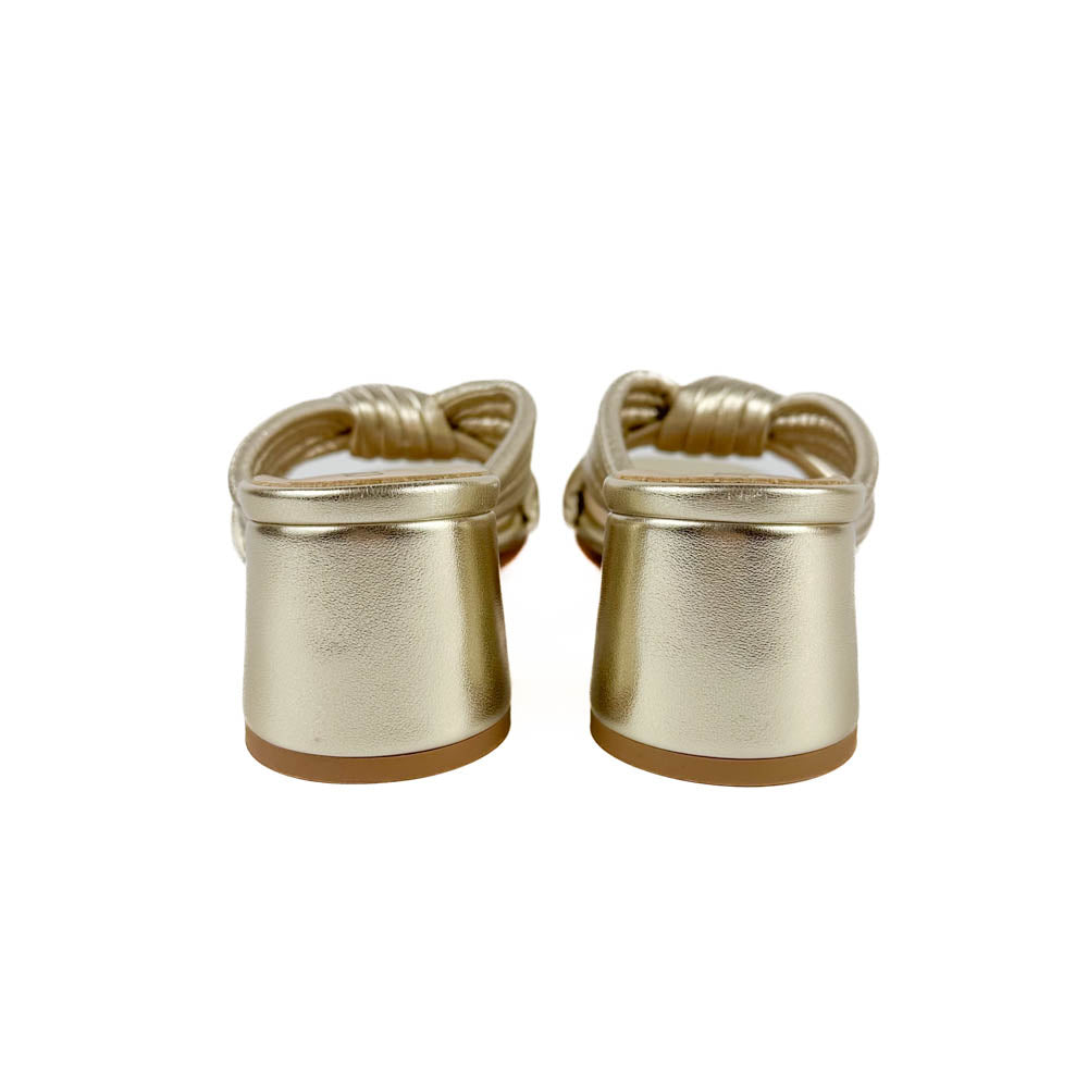 Knotted soft leather upper on wrapped block heel. The pretty platinum sandal with just the perfect amount of height that you'll keep in your collection forever.