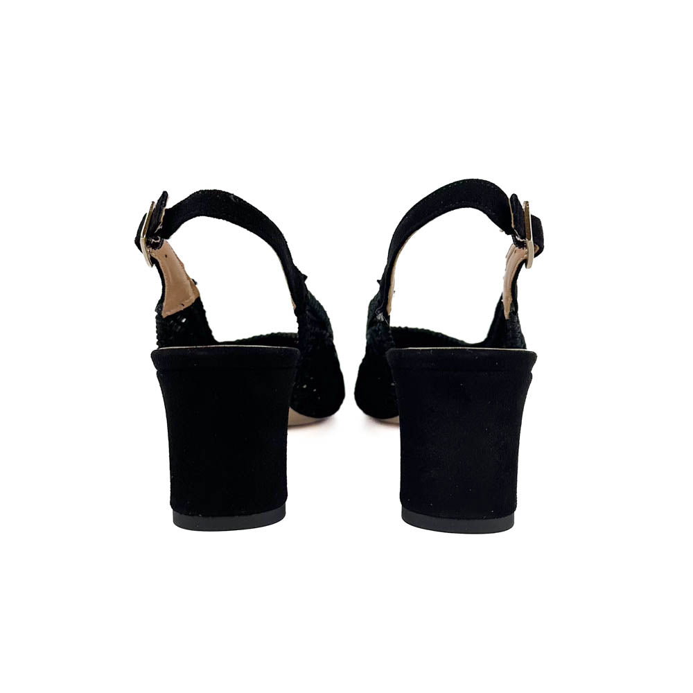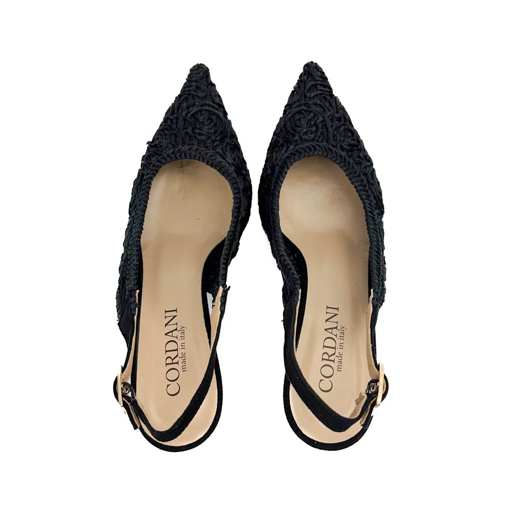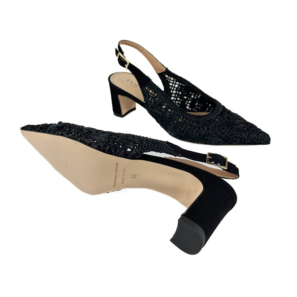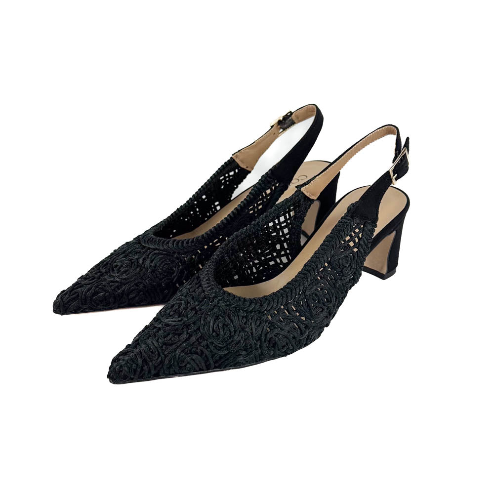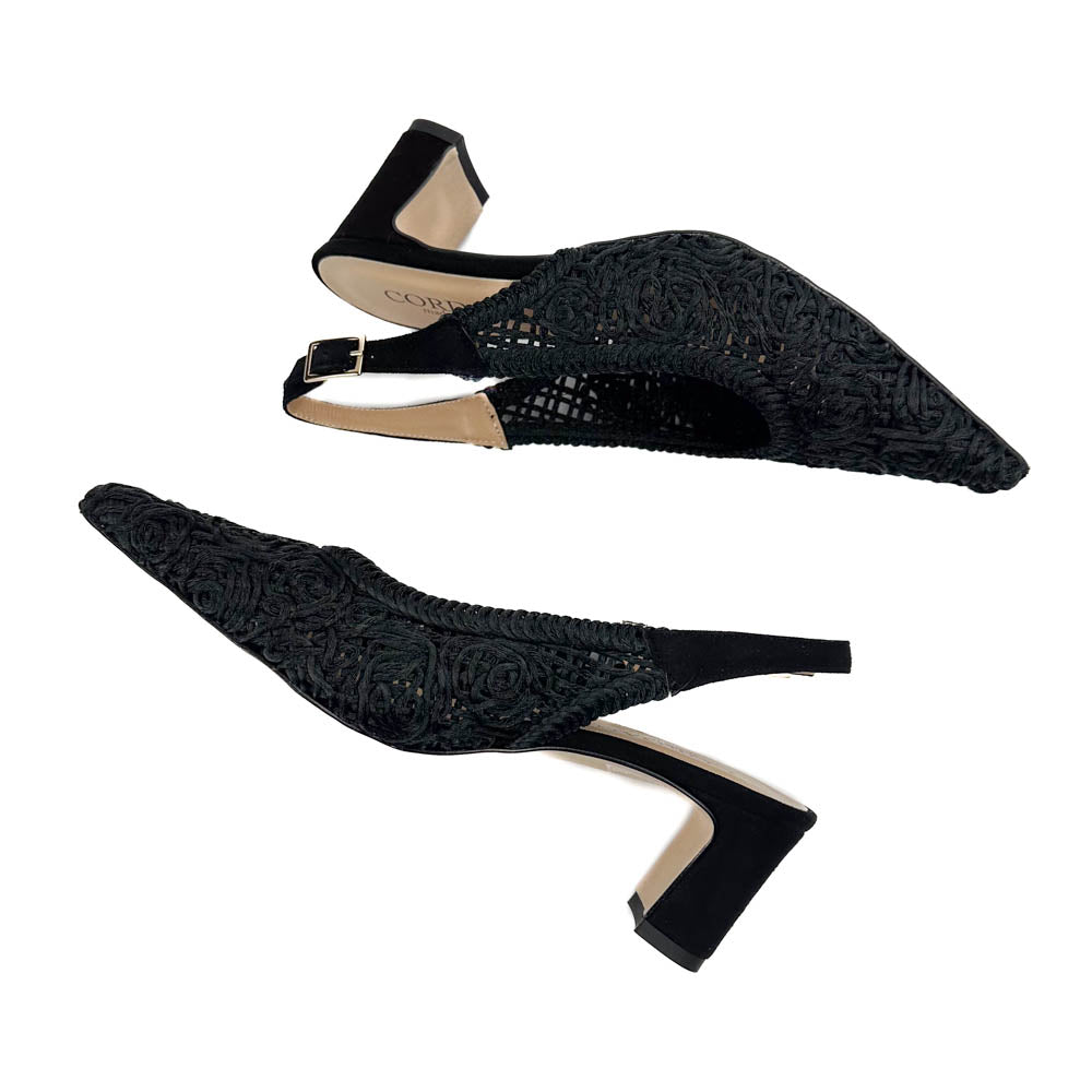 Intricately designed soutache upper with suede backstrap and wrapped heel. What looks like a basic black pump from afar catches the eye for its unique and timeless design. Made to look elegant and feel good.