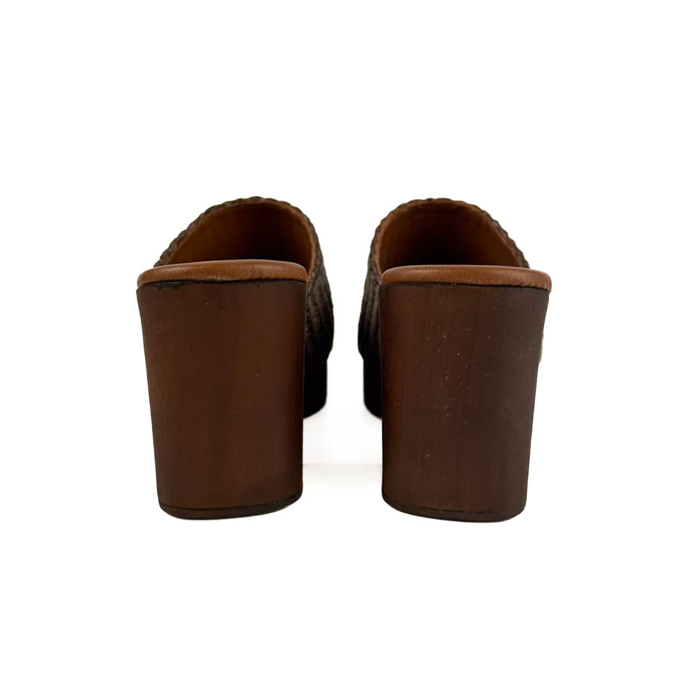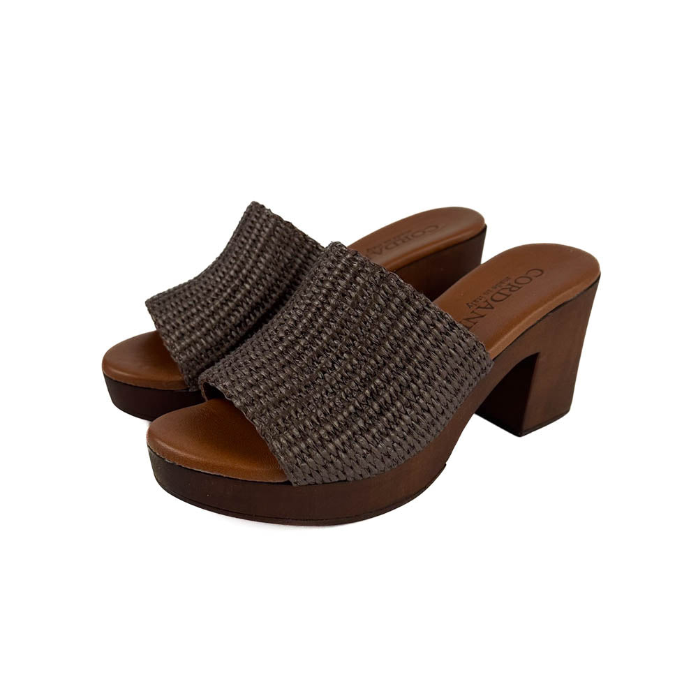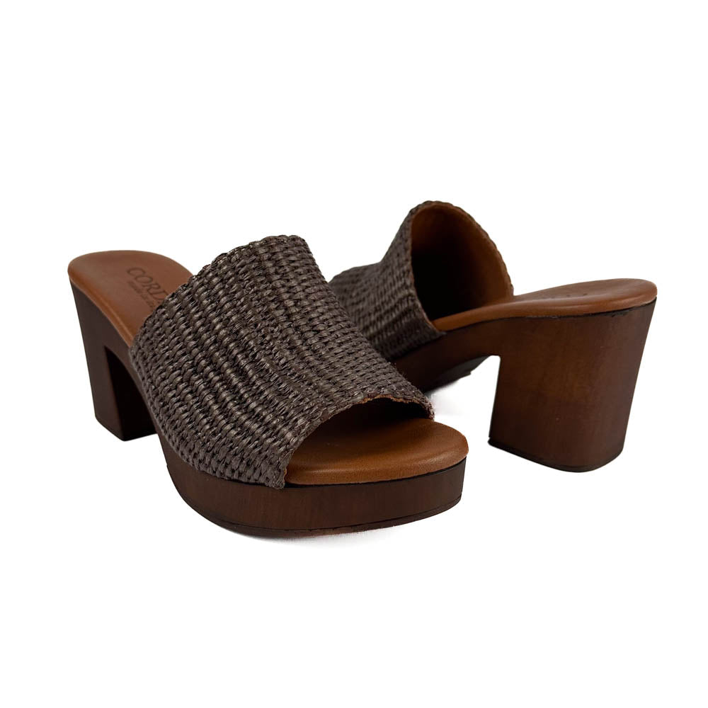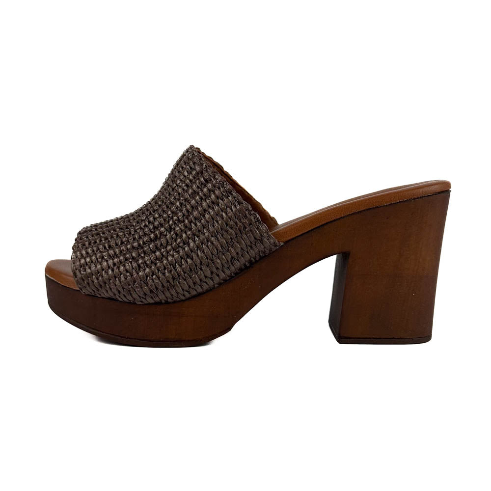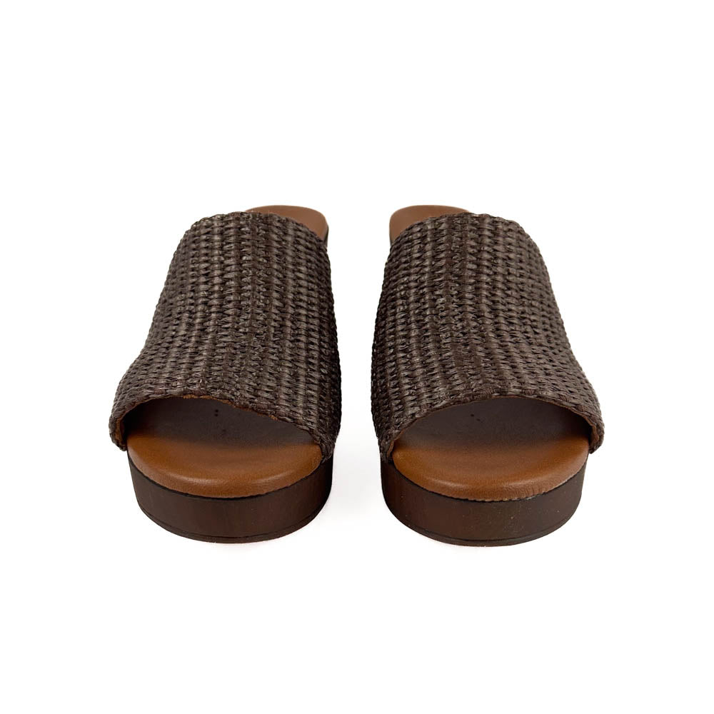 Classic silhouette woven raffia slip on sandal on wood-like platform. The cushy footbed and lightweight design make this a comfortable option from day to night!