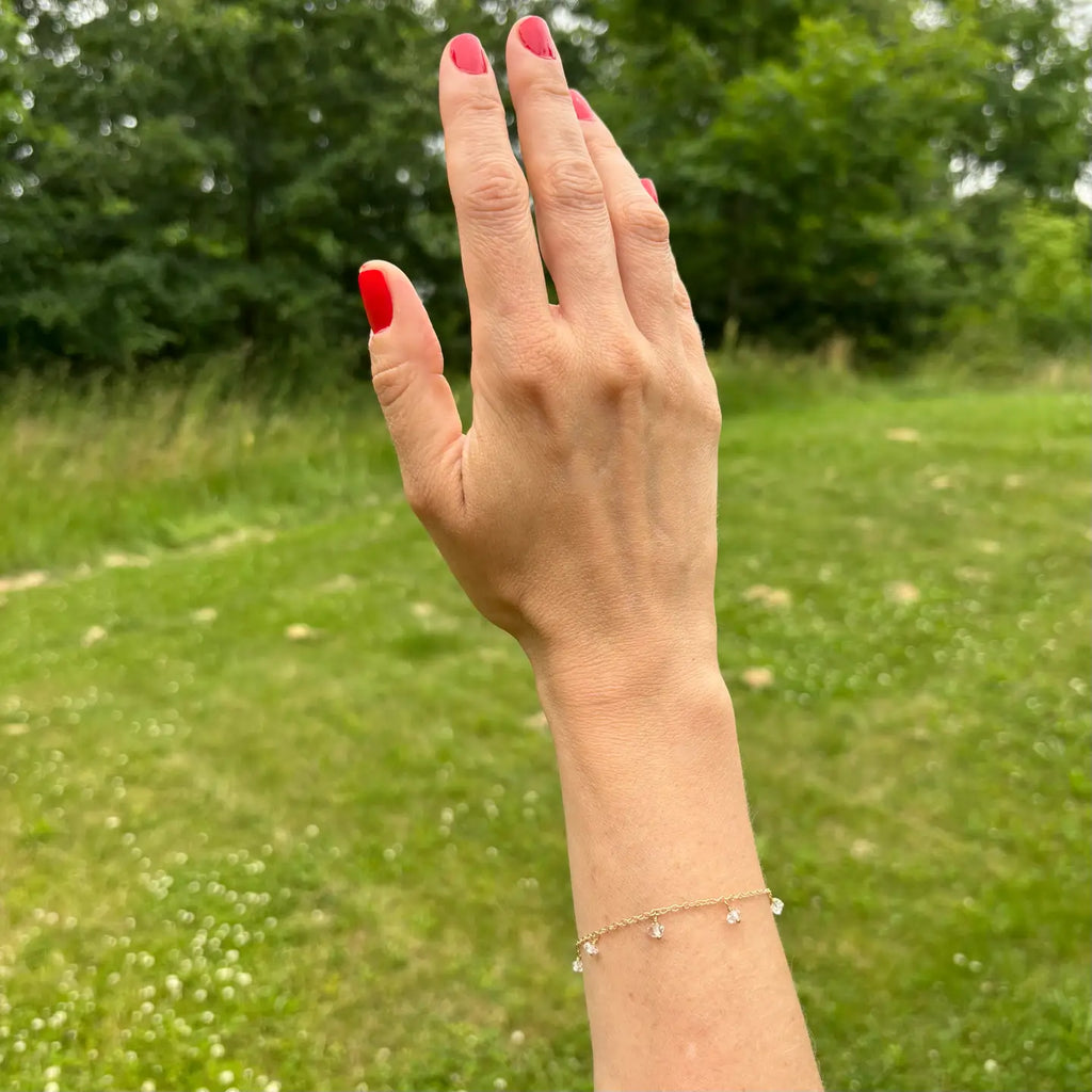 Minimalist herkimer diamond fringe on chain. This bracelet has a delicate feel that adds just a touch of shine to your bracelet stack.