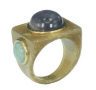 A striking fusion of color and form. Its bold, square granite resin band sets the stage for a round amethyst and amazonite stones, creating a vibrant play of tones that feels both fresh and modern. Accented with 18k gold-plated brass, this piece embodies sculptural elegance in modern design.