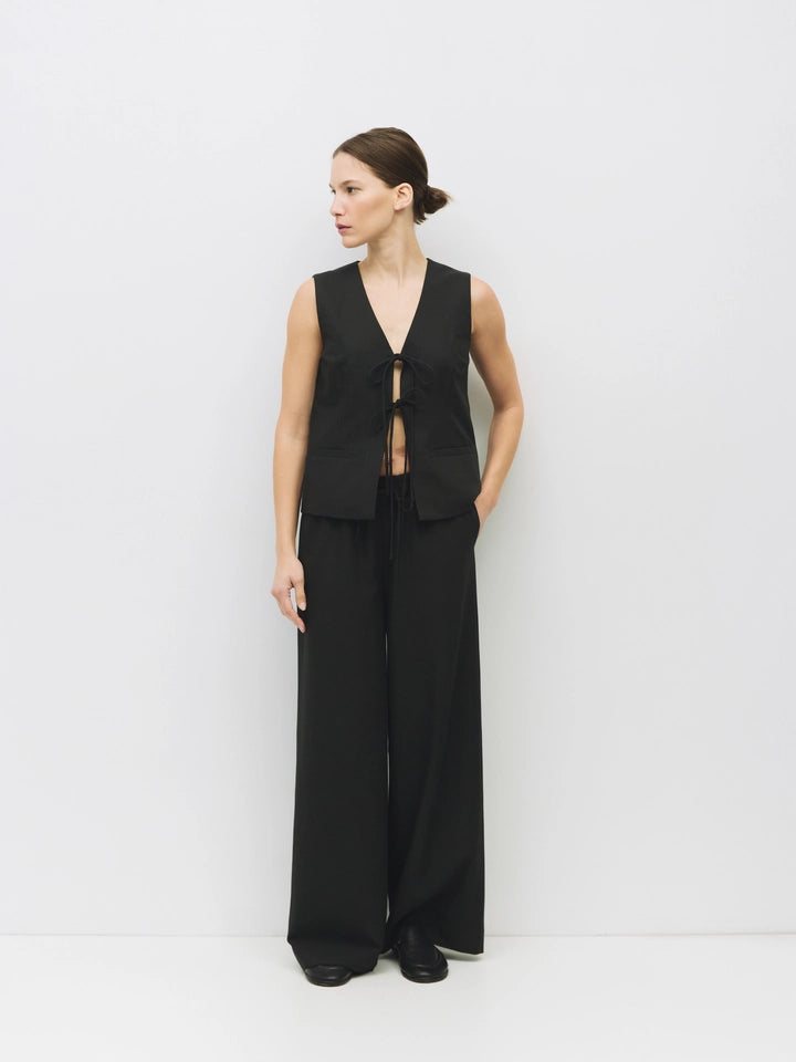 The Vera Pants are designed with a relaxed silhouette, wide legs, and an elasticized waistline for all-day comfort. With delicate front ties, side pockets, and back patch pockets.