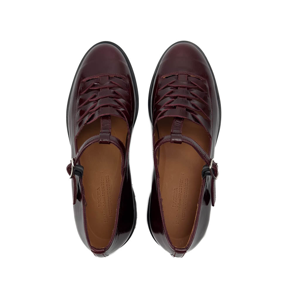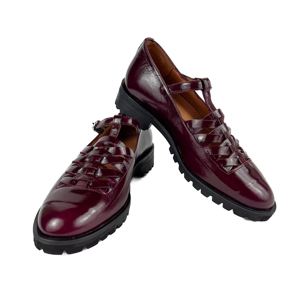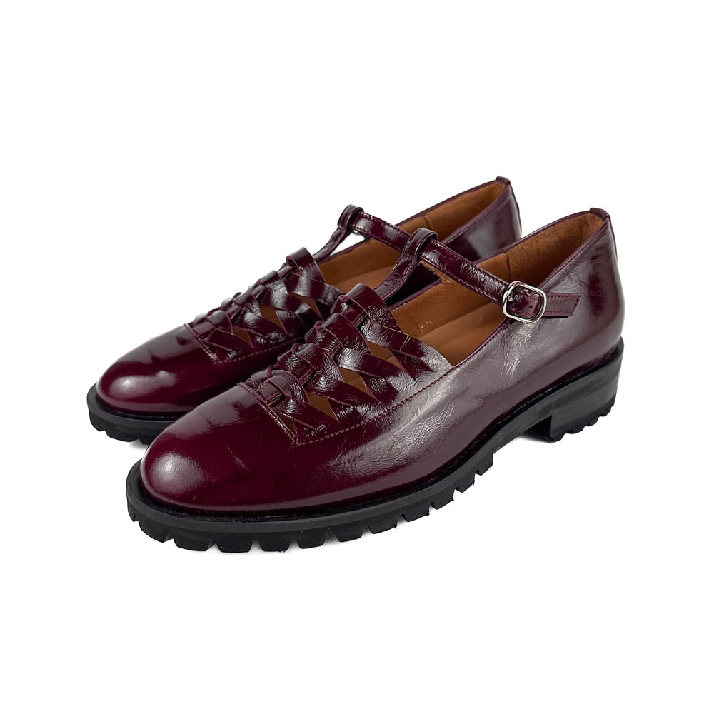 IMAI is a T-shaped Mary-Jane shoe with an intriguing woven detail. This shoe features a round toe in a deep burgundy shade with a shiny patent finish. Pair with some fun socks for extra style points!