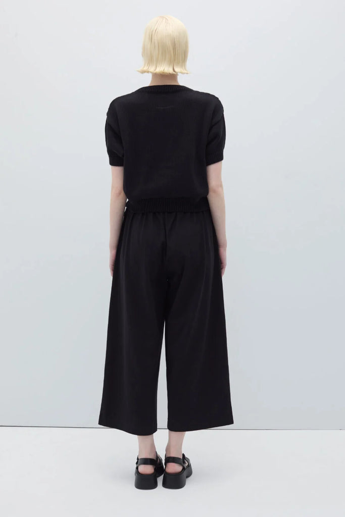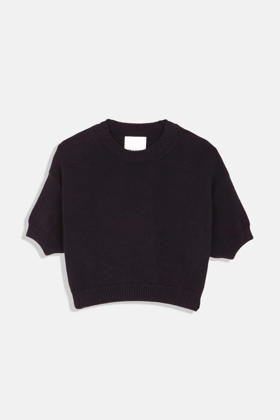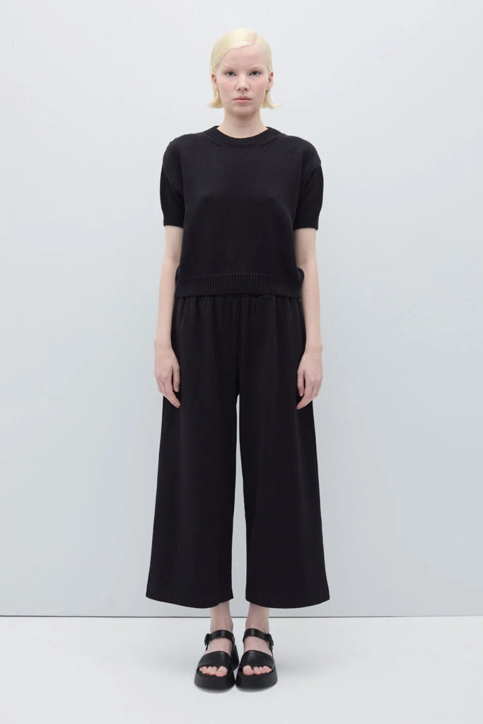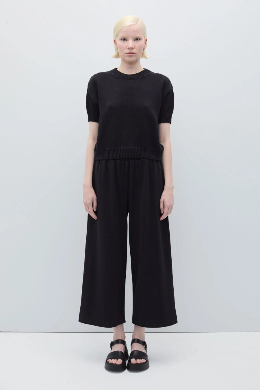 Wide cropped knit top in soft cotton. Short-sleeved with a trim round neckline and ribbed cuffs and hem.